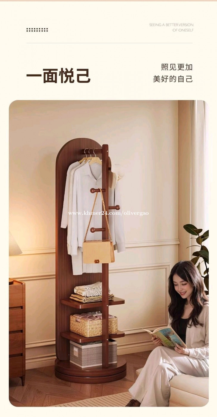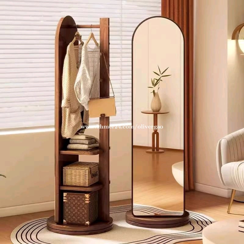 Full-body mirror, rotating mirror, dressing mirror, floor-standing full-body mirror; movable with coat hanger; integrated wardrobe hook; fitting mirror. Walnut color, height: 165 cm. 全身镜旋转镜子穿衣镜全身落地镜可移动带衣帽架一体挂衣架试衣镜 胡桃色,高度165cm