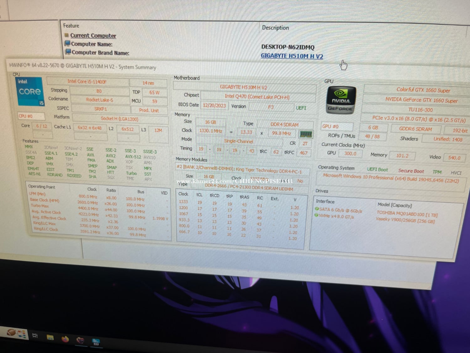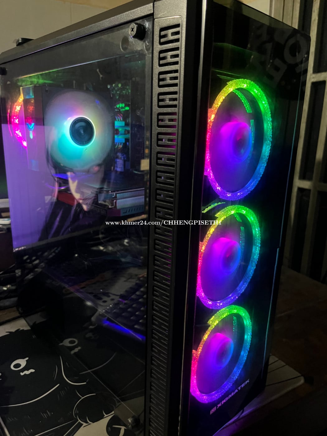 Gaming Desktop លេងហ្គេមធំ ការងារdesign ម៉ាអែម 3XX$ Cpu: I5-11400f Ram: DDR4 16gb x1 Motherboard: Gigabyte H510m-H v2 GPU: Colorful BattleAx GTX 1660 Super 6gb Storage: M2 NVME 256Gb, HDD 1TB Cooler: Jonsbo CR1200 EVO 120mm PSU: Zumax 550W 80+ Bronze Case: Xigmatek Fans: 4x ARGB fans with hub and controller ថែមsoftware, window, games ទីតាំងឬស្សីកែវ ភ្នំពេញ ទំនាក់ទំនង 017561xxxClick To Call Telegram: @CGPISETH