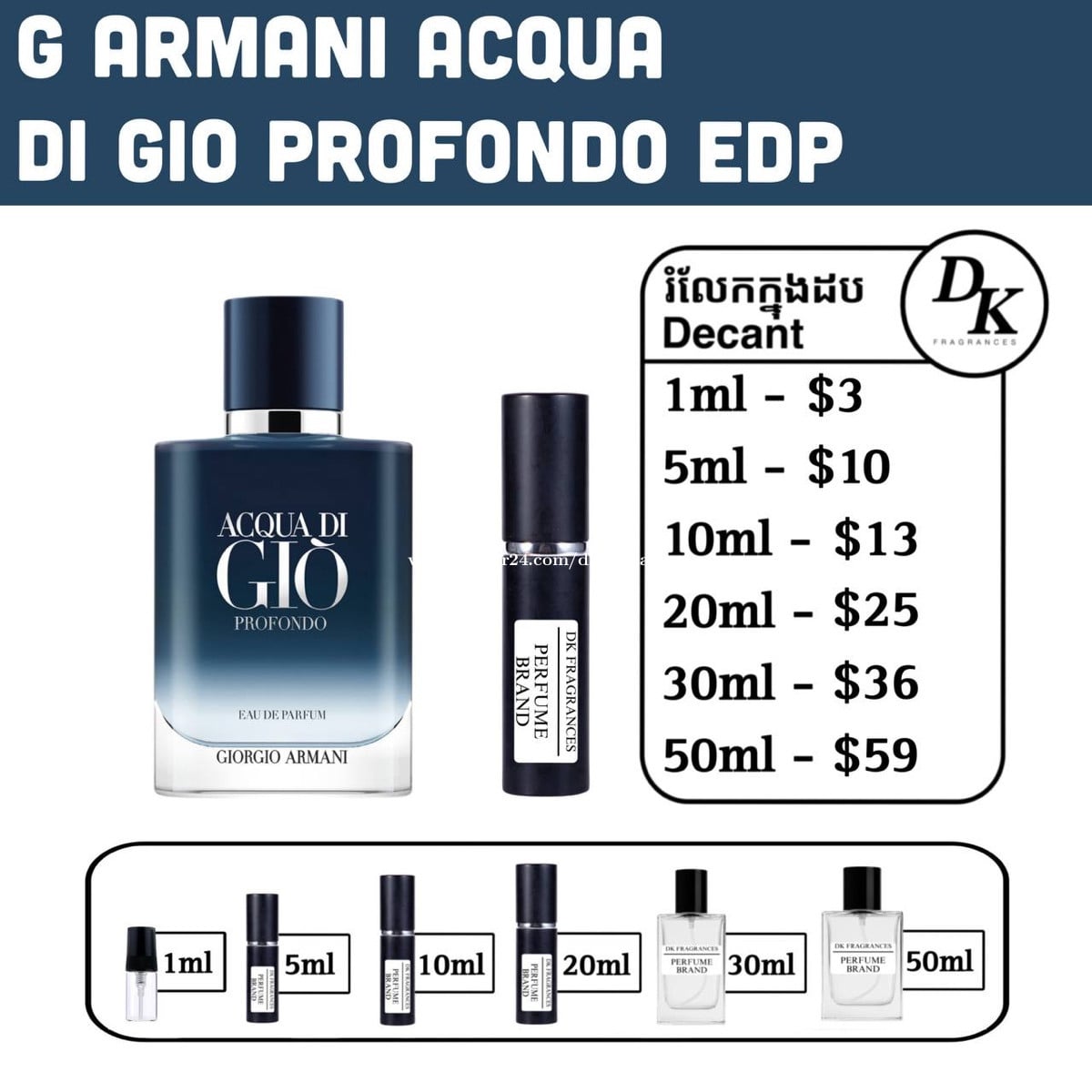 100ml full box - $109 ➡️ រំលែកក្នុងកូនដប/Decant in testing bottles: 1ml, 5ml, 10ml, 20ml, 30ml, 50ml. ☑️ DK Fragrances ធានាលោកអ្នកជាមួយនឹងឥវ៉ាន់សុទ្ធ original។ ជួញដូរដោយក្ដីស្មោះត្រង់។ ខាងខ្ញុំលក់ជា Full box (ដបធំ) និងរំលែកពី ដបធំ ចូលកូនដបសម្រាប់អ្នកចង់តេស្តក្លិន។ 📥 ទំនាក់ទំនងតាម Telegram: 011841xxxClick To Call Telegram channel: https://t.me/dkfragrancess ➡️ពត៌មានបន្ថែមអាចឆែកគេហទំព័រយើងខ្ញុំ: https://shoplinks.to/dkfragrances ✅ Note: DK Fragrances is an original perfume discounter in Phnom Penh, Cambodia (Established in 2024). ✅ We sell perfumes as in Full bottle (the original bottle), and decants (original perfume liquid extracted from big bottle and transferred to vials for testing purposes). ✅ We’ve executed thousands of successful sales—check out our Instagram/Tiktok to see real reviews and feedbacks from customers. 📥 Contact us on Telegram, or visit our website. Telegram channel: https://t.me/dkfragrancess Our website: https://shoplinks.to/dkfragrances ‼️ Why should I buy from DK Fragrances? - Guaranteed original products with good prices. - We ship all around Cambodia, with low shipping fees. - We allow Cash-on-Delivery service for Phnom Penh customers - Still don’t trust us? Visit our store directly in Phnom Penh! (See above for details). 🤔 FAQ (frequently asked questions) What is a tester box? A: It’s a simple version of a full box, different from what you see at the store. It usually comes in a plain white or cardboard box and is mainly used by perfume stores as a ‘tester’—that’s where the name comes from. However, there is no difference from any other original perfume; the juice is the same. What is a decant? A: A decant refers to a small testing vial or bottle. When customers want to try a perfume, we also sell it as a ‘decant’—from 1ml up to 50ml. We extract the juice from the original bottle using a syringe and transfer it into our own premium decant bottles. Decants are perfect for customers who want to test a fragrance without buying a full-size bottle.