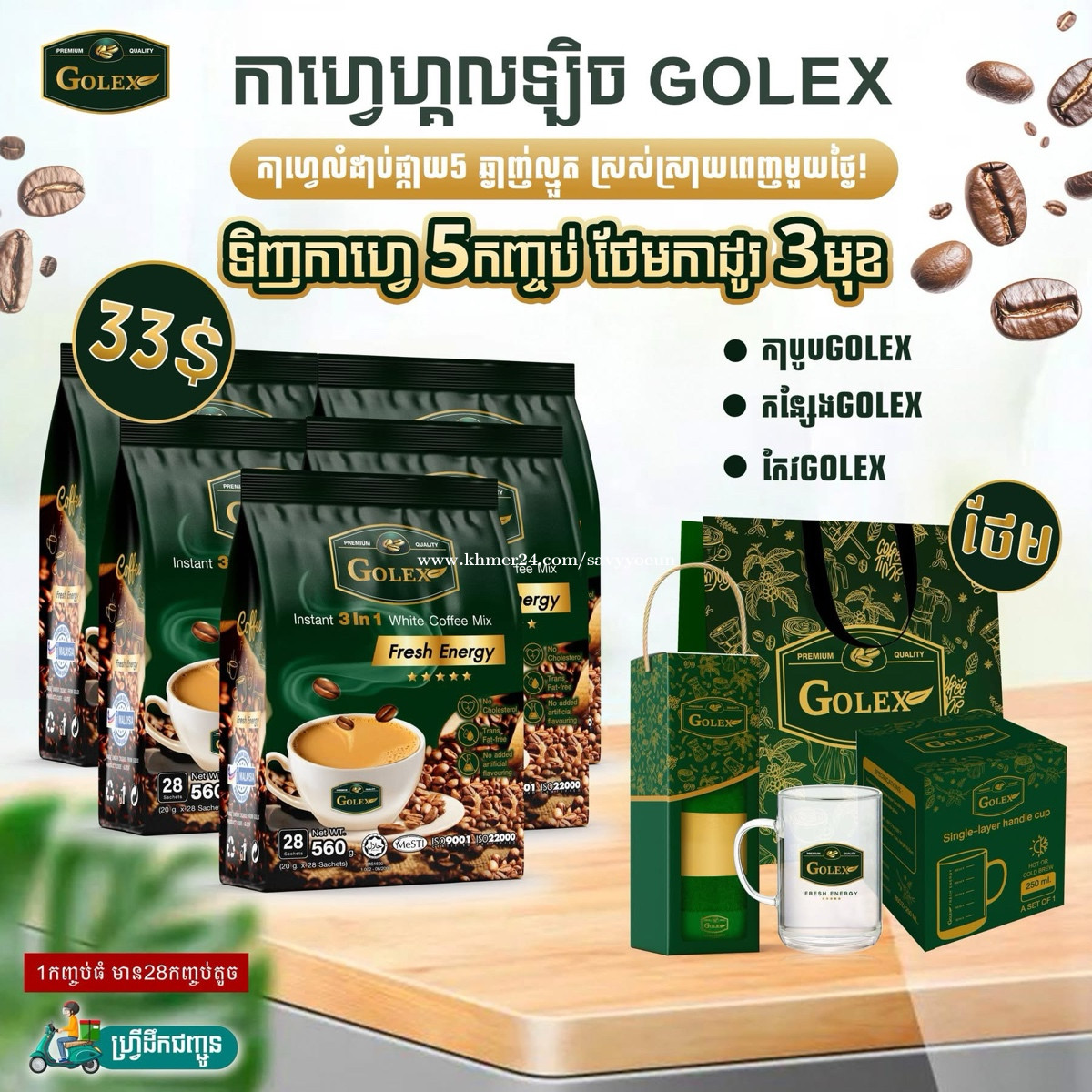☕️ កាហ្វេហ្គាលឡិច (GolexCoffee☕️ រស់ជាតិឆ្ងាញ់ ឈ្ងុយ មានគុណភាពខ្ពស់ 👍 ✨ ផលិតនៅប្រទេសម៉ាឡេស៊ី ✨ ប្រេនកូនខ្មែរ គាំទ្រផលិតផលខ្មែរ ✨ រស់ជាតិឆ្ងាញ់ ដូចកាហ្វេប្រេនល្បីៗ ដែលញាំហើយចង់ញាុំទៀត 📦 ក្នុងមួយកញ្ចប់ធំ មាន ២៨ កញ្ចប់តូច 📏 ក្នុងមួយកញ្ចប់តូច មានចំណុះ ២០ ក្រាម ☕️ ងាយស្រួលញាំ សាកសមសម្រាប់ពេលព្រឹក ឬពេលធ្វើការ។ 💯 សម្រាប់អ្នកស្រលាញ់កាហ្វេ មិនគួររំលង! 📩 ចាប់អារម្មណ៍ សូមទំនាក់ទំនងមកឥឡូវនេះ 📲011659xxxClick To Call