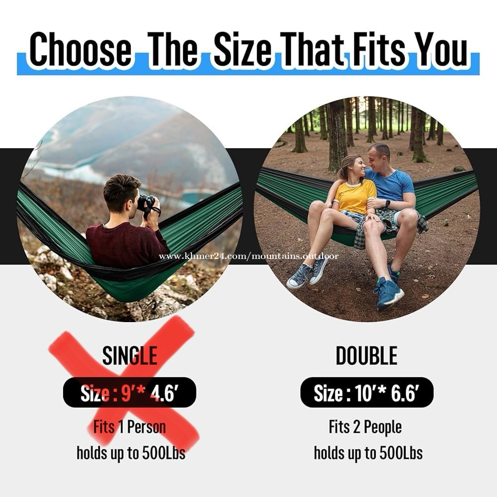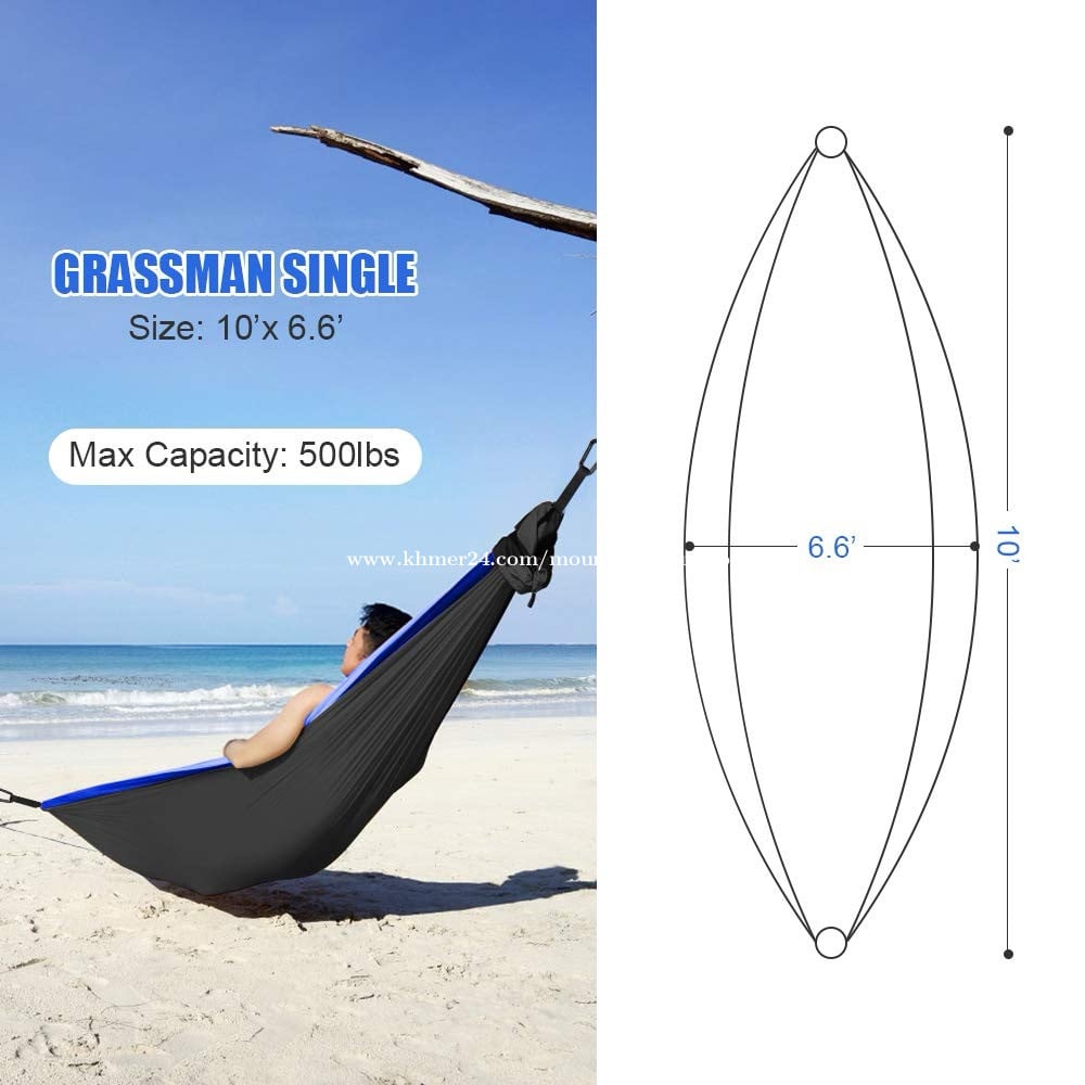 • 210T Parachute Nylon Hammock, Lightweight & Durable – Made with high-quality 210T parachute nylon for long-lasting use. • Easy to Set Up & Use – Spend more time relaxing and less time fumbling with setup. • Tree-Friendly Design – Comes with adjustable straps that won’t damage trees. • Triple Interlocking Stitching – Extra strength and safety for peace of mind. Specs: Double: 300 × 200 cm, 0.86 kg ————————————————————— *Contact:0966381xxxClick To Call/https://t.me/mountains_outdoor *Address:Borey Sorlar, 7A Street 371, Phnom Penh