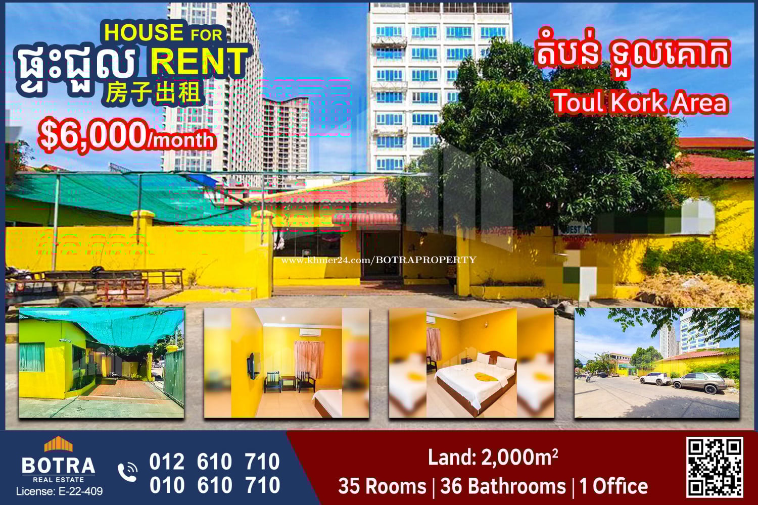 ๐ก Guesthouse for Rent #P1350 ๐ Location in Toul Kork Area - Land size: 2,000m2 - 35 Rooms | 36 Bathrooms - 1 Office - Price: $6,000/month โโโโโโโโโ Contact us now ๐ 012610xxxClick To Call (Cellcard) ๐ 010610xxxClick To Call (Smart) โถ๏ธ t.me/BotraRealEstate (Chat)