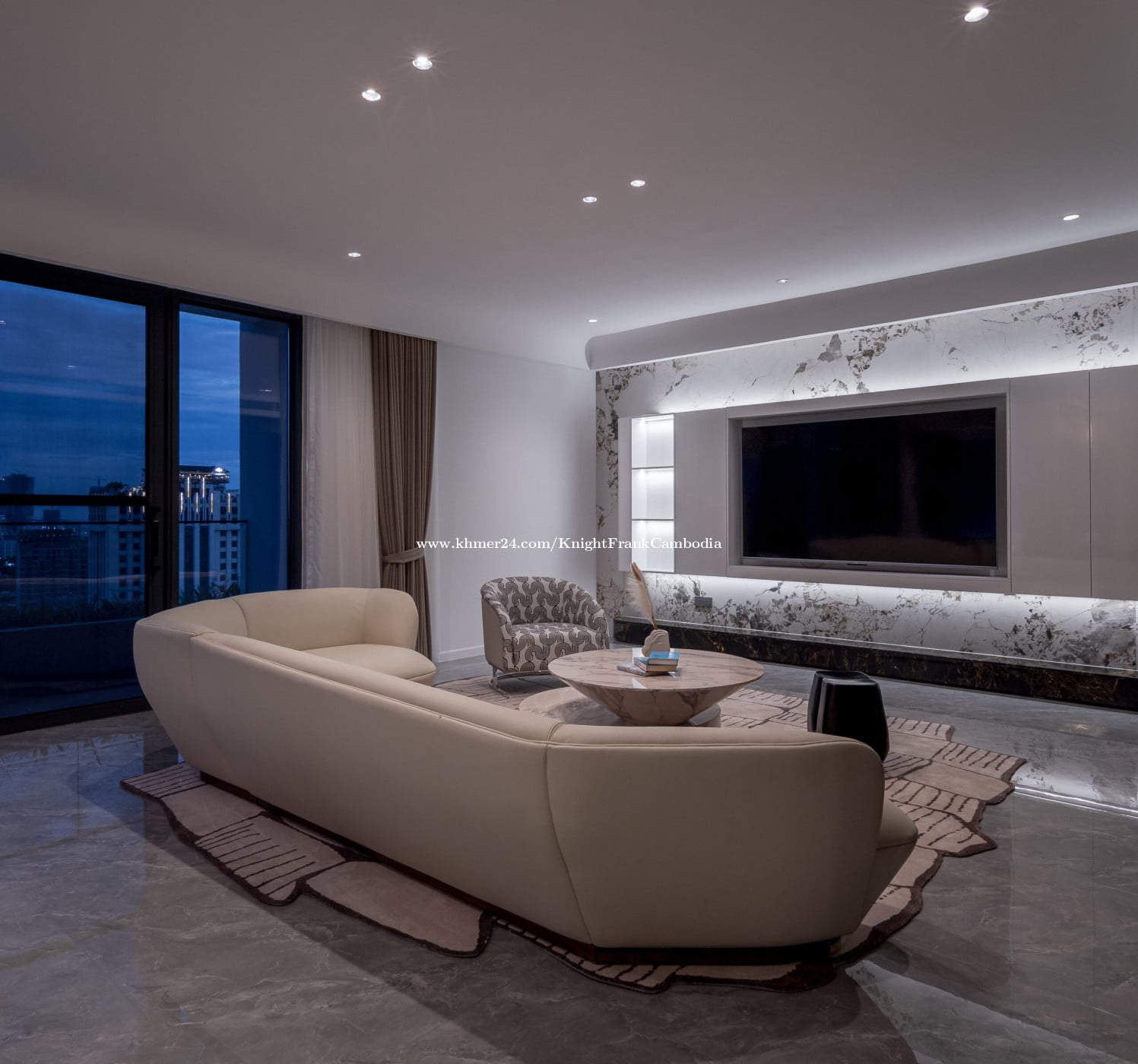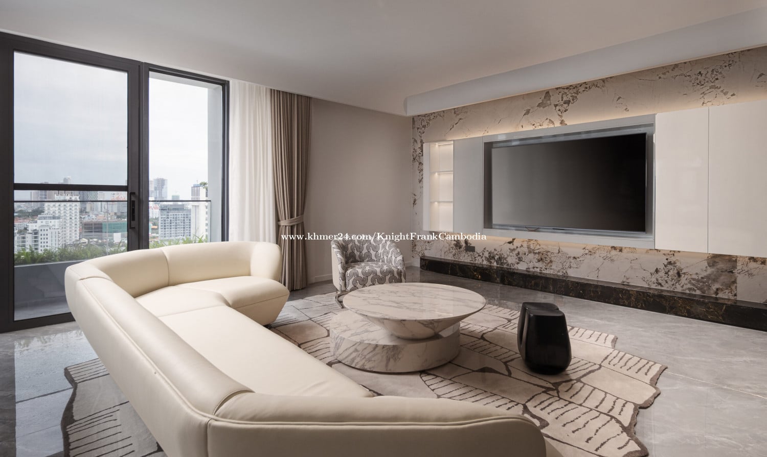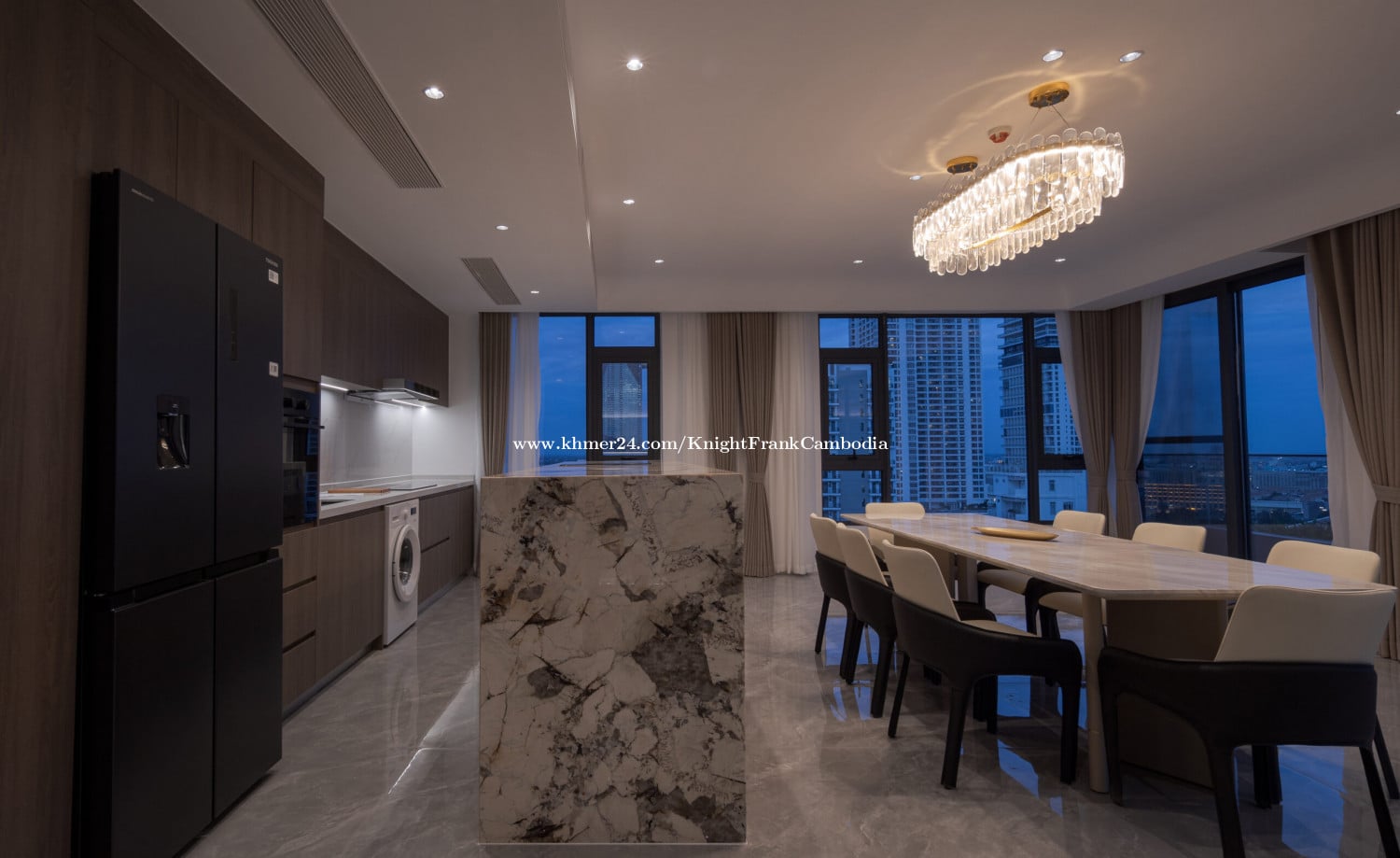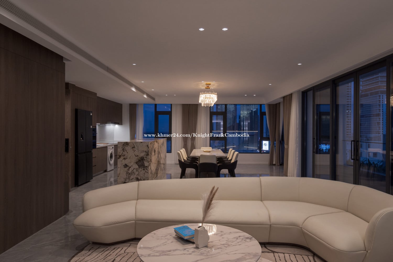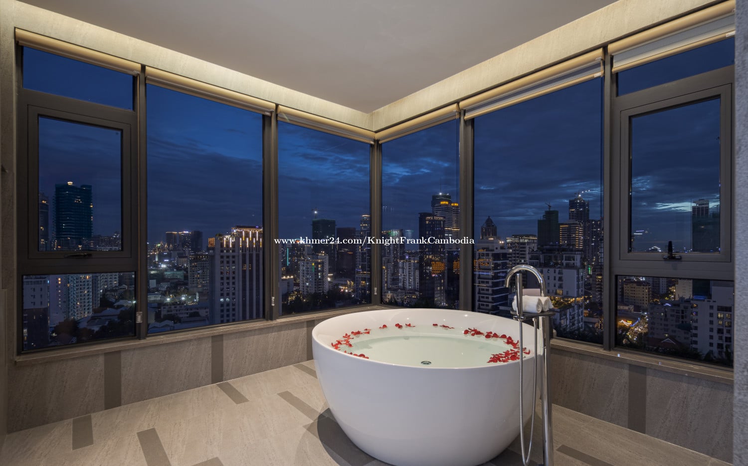 High-end Penthouse for lease Discover refined urban living in this exclusive three-bedroom penthouse located in the heart of Bassac Lane, Tonle Bassac, Chamkarmon. Offering a generous 220 sqm of elegantly designed living space, this home blends modern sophistication with comfort and privacy. The residence features a spacious open-plan living and dining area, complemented by a sleek contemporary kitchen with premium finishes and a striking marble island—ideal for entertaining. Floor-to-ceiling windows frame stunning city views and fill the space with natural light. A standout feature is the luxurious bathroom with a freestanding bathtub set against panoramic skyline views, creating a serene, spa-like retreat above the city. Monthly Rate Includes • Fully furnished apartment • High-speed Wi-Fi & IP TV • Housekeeping with linen change (twice weekly) • Access to rooftop swimming pool, gym & co-working space • 24/7 concierge & security • 1 motorbike parking space • Water usage Additional Charges • Electricity: USD 0.25 / kWh Bassac Lane is a lively and trendy area in Tonle Bassac, Chamkarmon, known for its stylish cafés, restaurants, and cocktail bars. Popular with expats and professionals, it offers a vibrant lifestyle while remaining convenient and walkable. Located just minutes from BKK1, AEON Mall, and the city’s key districts, Bassac Lane is ideal for modern urban living.
