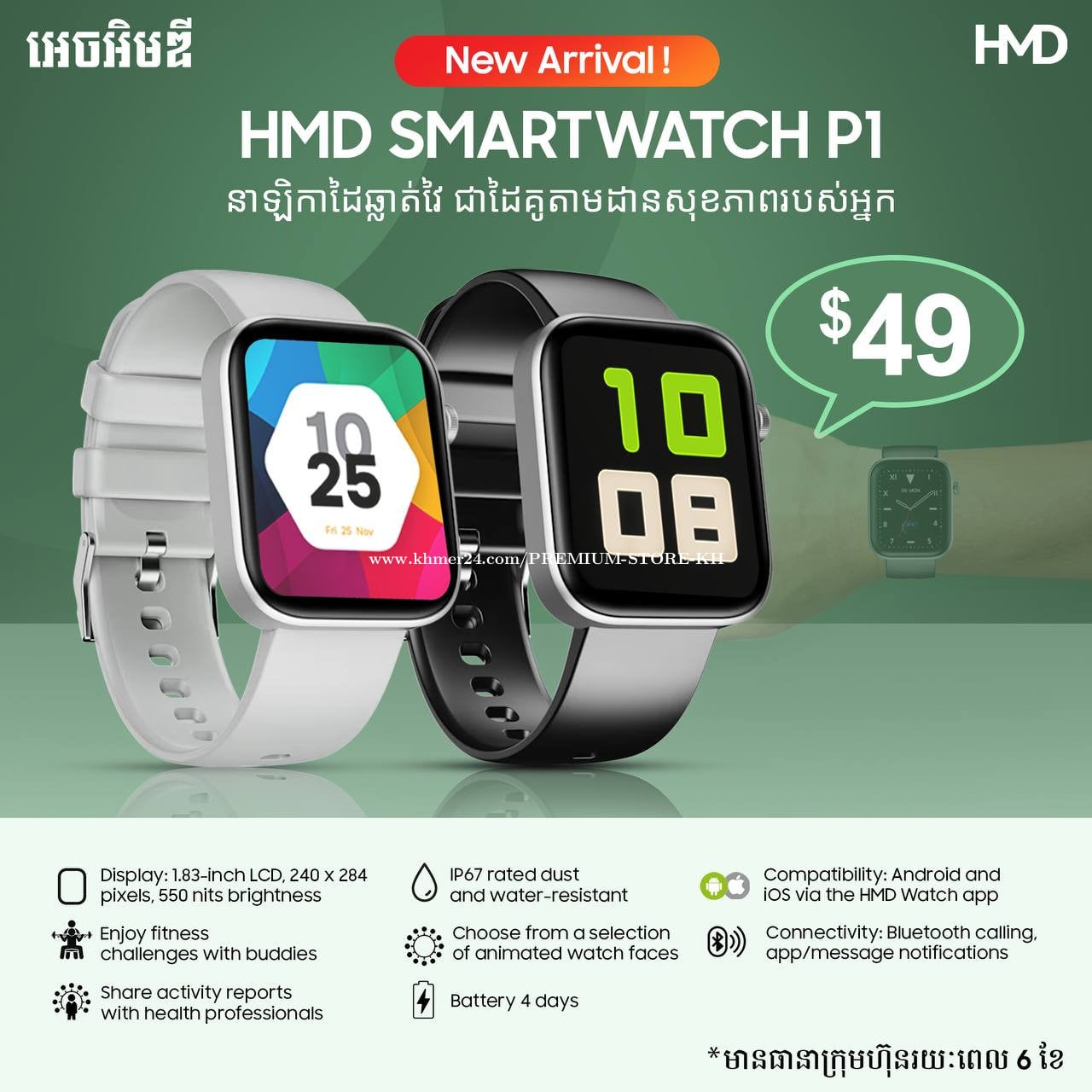 HMD Smartwatch P1 (New Arrival) ⌚ លក្ខណៈពិសេស អេក្រង់៖ 1.83 អ៊ីញ LCD Resolution: 240 × 284 pixels ពន្លឺដល់ 550 nits (មើលច្បាស់ក្រៅផ្ទះ) ការពារទឹក/ធូលី៖ IP67 (អាចលាងដៃ ឬជួបទឹកភ្លៀងបាន) ថ្ម៖ ប្រើបានប្រហែល 4 ថ្ងៃ Watch Faces៖ មានមុខនាឡិកាចលនា (Animated) ច្រើនជម្រើស ការតភ្ជាប់៖ Bluetooth Calling ជូនដំណឹង App & Message ឆបគ្នា៖ Android និង iOS (តាម HMD Watch App) សុខភាព & កីឡា៖ តាមដានសកម្មភាពហាត់ប្រាណ ប្រកួត Fitness ជាមួយមិត្ត ចែករំលែករបាយការណ៍សកម្មភាព