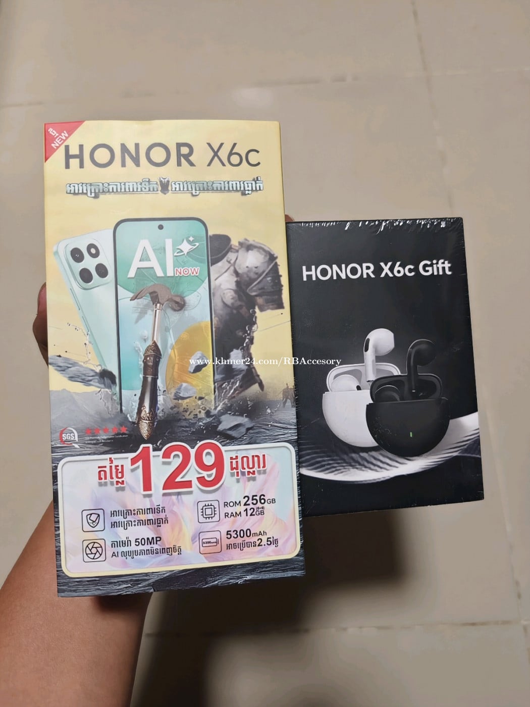 #ចូលស្តុកហើយម៉ូយៗ💥 Honor X6c ទូរស័ព្ទស្ដើងរាងស្អាត ធន់នឹងការធ្លាក់ ធន់នឹងទឹក ថែមកាដូ4មុខ 🎁កាសBluetooth 🎁 Case 🎁 Screen 🎁 ជើងទ្រទូរសព្ទ័ #លក្ខណៈពិសេស ▪️Ram 6G+6G ▪️Memory 128GB / 256GB ▪️ ថ្មធំ 5300mAh (ល្បឿនសាក 35W) ▪️ កាមេរ៉ា 50MP ▪️ ធន់នឹងការធ្លាក់ ▪️មានអាវក្រោះការពារទឹក IP64 ▪️ល្បឿនអូសលើអេក្រង់ 120Hz ▪️មានមុខងារ AI ច្រើនសំបូរបែប 📲មាន3ពណ៌សម្រាប់ជ្រើសរើស