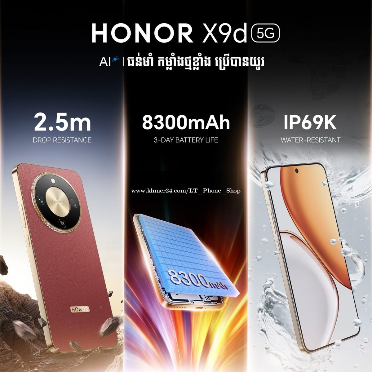 🔊HONOR X9d (12GB+12GB/256GB) ធន់មាំ កម្លាំងថ្មខ្លាំង ប្រើបានយូរបំផុត មិនថាធ្លាក់ពីទីខ្ពស់ៗ ធ្លាក់ចូលទឹក ឬទង្គិចជាមួយរបស់រឹងៗនោះទេ បត់បែនបានគ្រប់កាលៈទេសៈ។ 💰តំលៃ 349$ បញ្ចុះតំលៃនៅសល់ត្រឹម 325$ តែប៉ុណ្ណោះ 🎁មានថែមកាតាប, សំបកការពារ, នូងស្រ្គីនការពារ 💎ថ្មីធានា1ឆ្នាំ 💎រ៉េម 12GB+12GB និង មេម៉ូរី 256GB 💎កំលាំងកំពូលថ្ម8300mah 💎ការពារទឹកIP69k 💎ធន់រឹងមាំ360ដឺក្រេ តាន់បីជាន់ទទួលស្គាល់ដោយSGS 💎មានបីពណ៍សំរាប់ជ្រើសរើស: ពណ៍ក្រហម, ពណ៍ខ្មៅ, និងពណ៍មាស 🏡 ហាងលក់ទូរស័ព្ទដៃទំនើប អិលធី 📲 ទំនាក់ទំនងលេខទូរស័ព្ទ: 016711xxxClick To Call (Telegram) / 099333xxxClick To Call / 0888884xxxClick To Call 📩 Telegram: https://t.me/LTPhoneShop 📬 Facebook Page: https://www.facebook.com/share/165XEwR2ZA/?mibextid=wwXIfr 🗺️ ផ្ទះលេខ139c, ផ្លូវលេខ143 កែងផ្លូវលេខ376, សង្កាត់បឹងកេងកង3, ខណ្ឌបឹងកេងកង, រាជធានីភ្នំពេញ 📍Google map: https://maps.app.goo.gl/phENGCSAT33SaM9r7?g_st=com.google.maps.preview.copy 🛵 មានសេវាដឹកជញ្ជូនគ្រប់ខេត្តក្រុងរាជធានី
