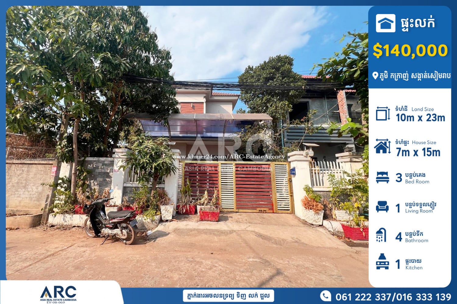 ផ្ទះលក់ (មានចំណូលជួល) ស្ថិតនៅលើផ្លូវបេតុង: ■ ទំហំដី៖ 10m x 23m= 230ម៉ែត្រការ៉េ ■ ទំហំផ្ទះ៖ 7m x 15m x 2ជាន់ ■ ជាន់ផ្ទាល់ដី និងជាន់ទី1 ■ បន្ទប់គេង៖ 3 បន្ទប់ទឹក 4 ■ ផ្ទះបាយ៖ 1 ■ កន្លែងទទួលភ្ញៀវ៖ 1 ■ ចំណតឡាន៖ 2ឡាន ■ តម្លៃលក់៖ $285,000 ■ ទីតាំង៖ សង្កាត់សៀមរាប ក្រុង និងខេត្តសៀមរាប - ពត៌មានបន្ថែមសូមទំនាក់ទំនង / For more detail៖ ☎️ 016 333139 (Smart) / 061222337 (Cellcard) 👉Personal Telegram Agent: https://t.me/arcsiemreap 👉 Website: www.arc.com.kh 👉 អាជ្ញាប័ណ្ណ៖ EV-08-069