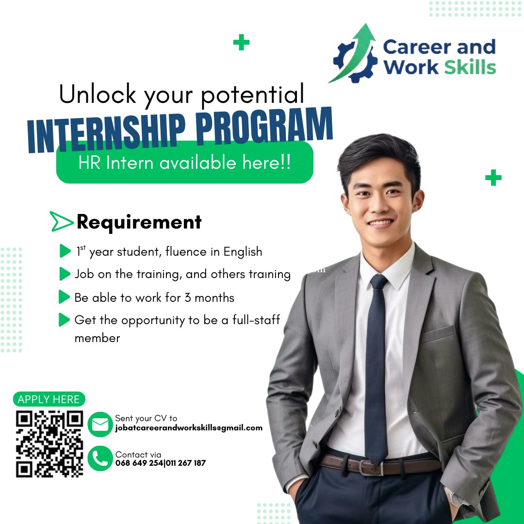 ๐Grow your career with us - HR Internship * Requirement โข 1st year student, fluent in English โข Job on the training, and others' training โข Monthly allowance โข Get the opportunity to be a full-staff member Location: Sangkat Phsar Derm Thkov, Phnom Penh Contact us: * Email: job*********************@gmail.comClick To Sent Email * Facebook: Link-Pi Sey (https://www.facebook.com/Seykk098) * LinkedIn: Link-OM Pisey (http://www.linkedin.com/in/seykk9999) * TikTok: Link-Employment Agency (http://www.tiktok.com/@khmeremployment.agency) * Facebook page: Link-Career and Work Skills (https://www.facebook.com/share/17oM9BBix6/?mibextid=wwXIfr) * Telegram: 068649xxxClick To Call/011267xxxClick To Call * Phone Number: 068649xxxClick To Call * Telegram channel: Link-แแธแแแแถแแแแถแแแถแแแถแ-Employment Agency (https://t.me/khmeremploymenagency)