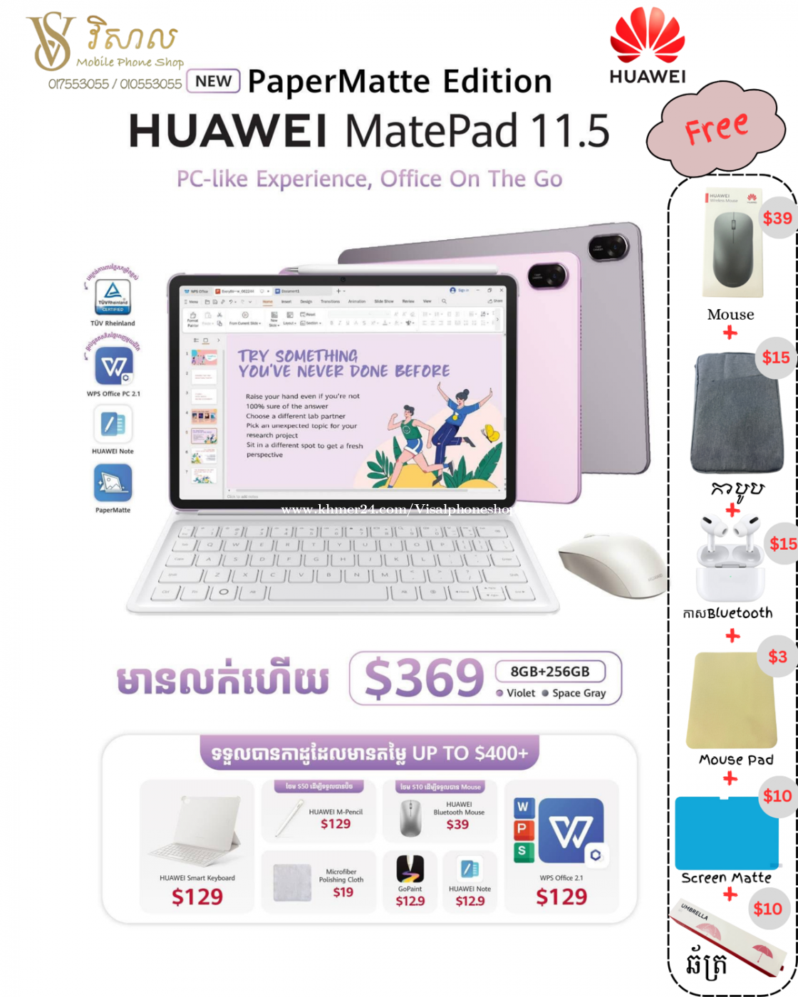 $369 (ប៊ិចថែម$50) Ram8G memory 256G Warranty 1year from Huawei 🎁 case+keyboard 🎁 mouse Huawei original 🎁 កាសBluetooth 🎁 mousepad 🎁 bag 🎁 umbrella 🌂 🎁 screen matte