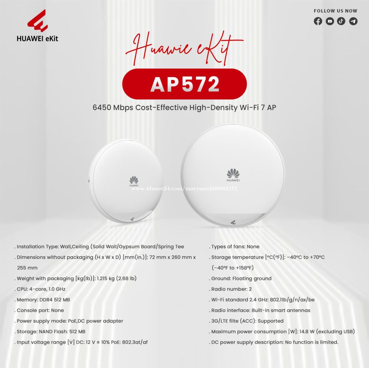 HUAWEI Wi-Fi 7 6450Mbps 130users Dual RF 6 streams 2.4G 2*2+5G 4*4 1x2.5GE electrical uplink + 1xGE electrical uplink Model: AP572