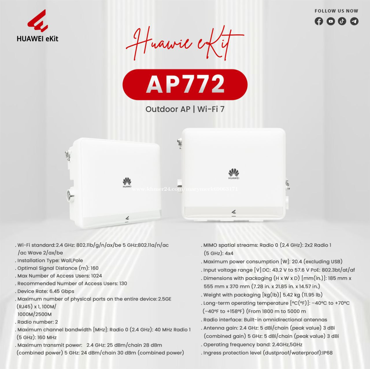 HUAWEI Wi-Fi 7 6450Mbps 130users omnidirectional antenna 160m Two radios and six streams 2.4GHz 2*2+5GHz 4*4 1x10GE optical port+1x2.5GE PoE port Model: AP772