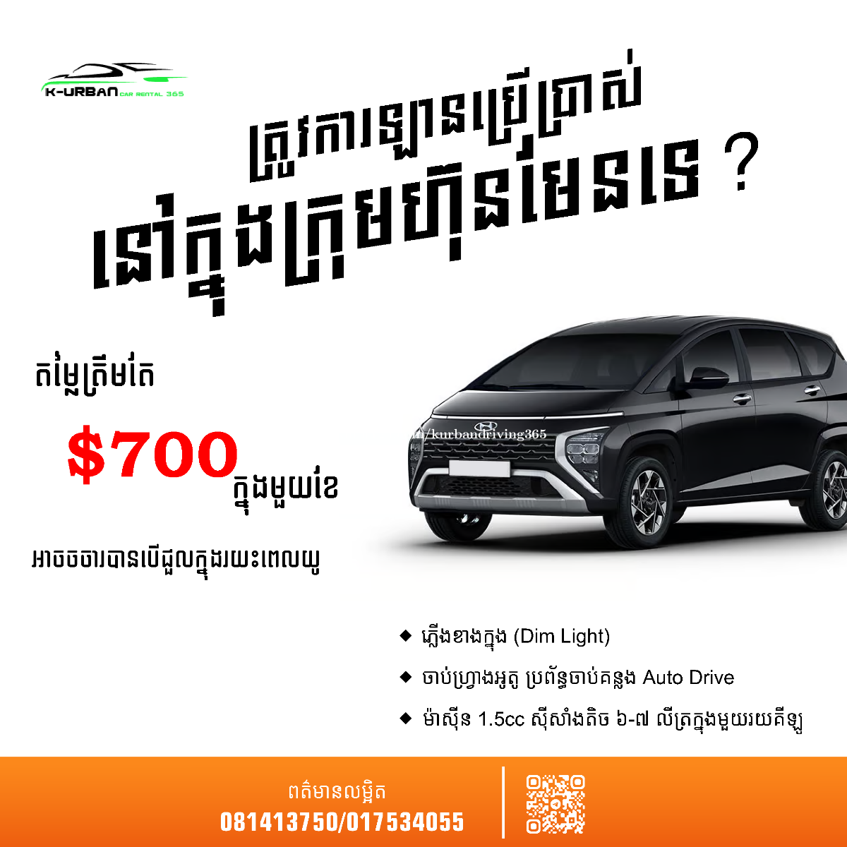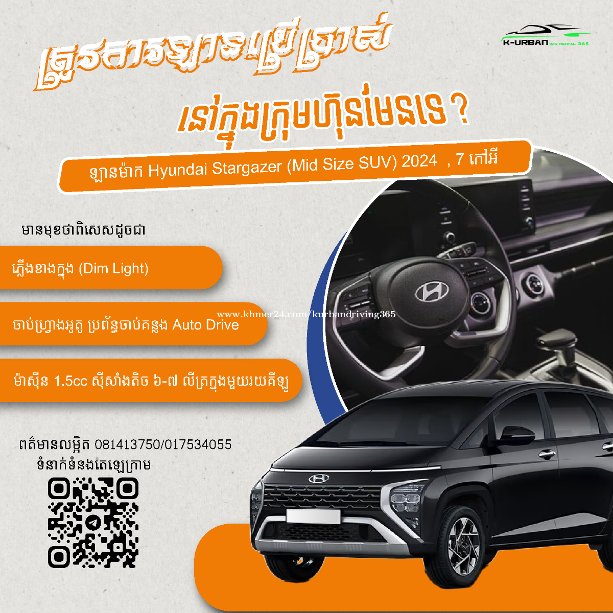 •ឡានម៉ាក Hyundai Stargazer (Mid Size SUV) •ឆ្នាំផលិត 2024 មានមុខងារពិសេសដូចជា •ចាប់ហ្វ្រាងអូតូ •ភ្លើងខាងក្នុង (Dim Light) •ម៉ាស៊ីន 1.5cc ស៊ីសងតិច ៦-៧ លីត្រក្នុងមួយរយគីឡូ •៧ កៅអី •ប្រព័ន្ធចាប់គន្លង •Auto Drive ផងដែរ តម្លៃចាប់ពី $700 ក្នុងមួយខែ និងអាចចចារបានបើជួលក្នុងរយះពេលយូ ***(+855)-17534055/81413750