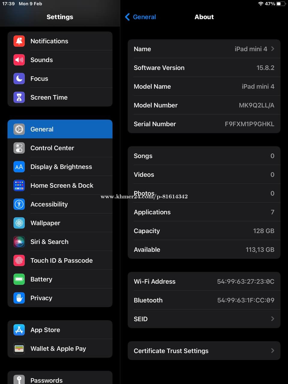IPad Mini 4 | 128 GB នៅស្អាត់, No Icloud locked Never repair No cable, no power adapter