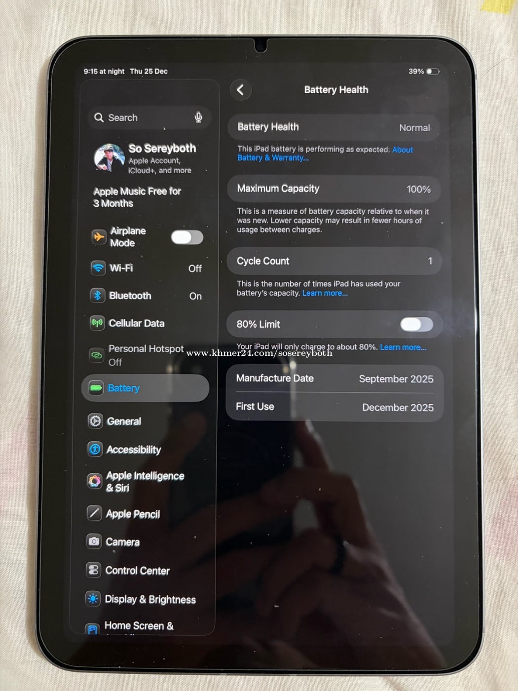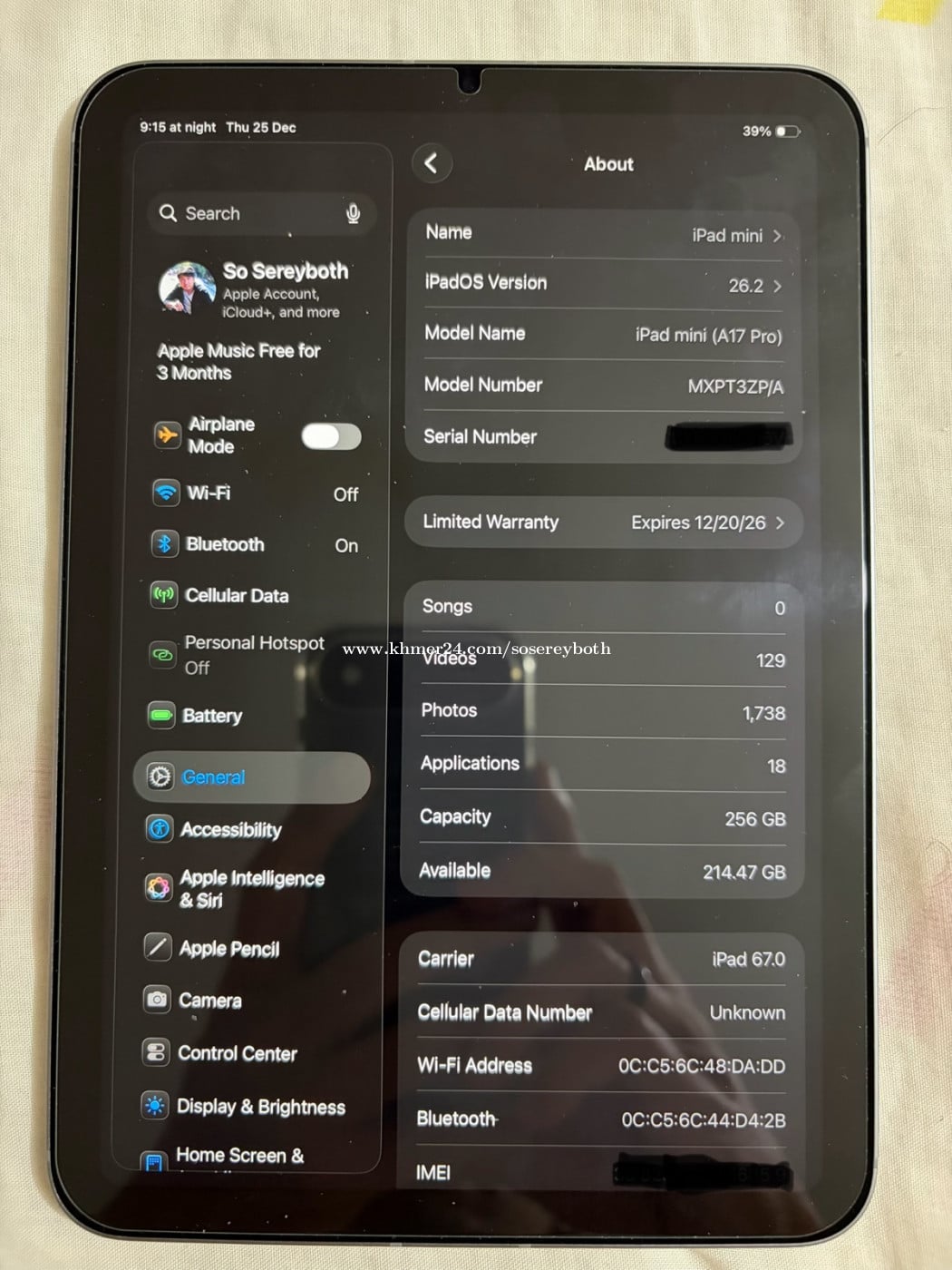 iPad mini 7 (eSIM) Storage: 256GB Battery: 1 Cycle Count Condition: 99.99% Bought: December 2025