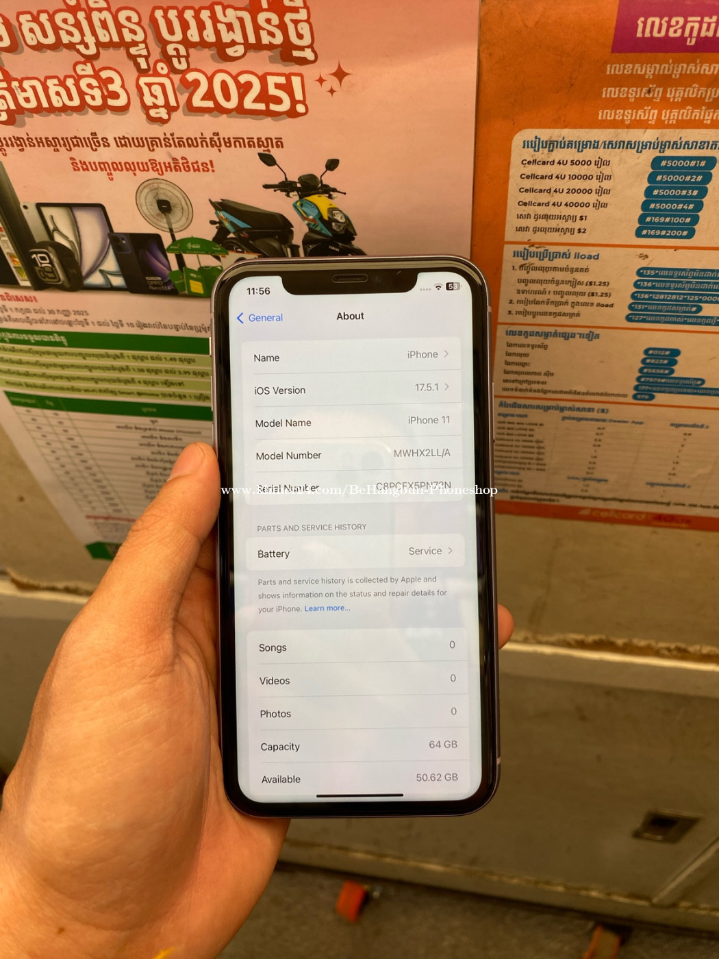 iPhone 11 64G មួយទឹកស្អាត98.99% មានស្កេន ធានាម៉ាសុីនហ្សុីន អេក្រង់ហ្សុីន នឹងធានាការប្រេីប្រាស់រយៈពេល15ថ្ងៃ មានឆ្នាំងសាក មានបង់រំលស់ជាមួយហាង មានសេវ៉ាដឹកជញ្ជូន25ខេត្ត-ក្រុង ទីតាំង : ជិតស្តុបលូប្រាំ ស្ទឹងមានជ័យ Tel : 099777xxxClick To Call / 081336xxxClick To Call / 0972312xxxClick To Call