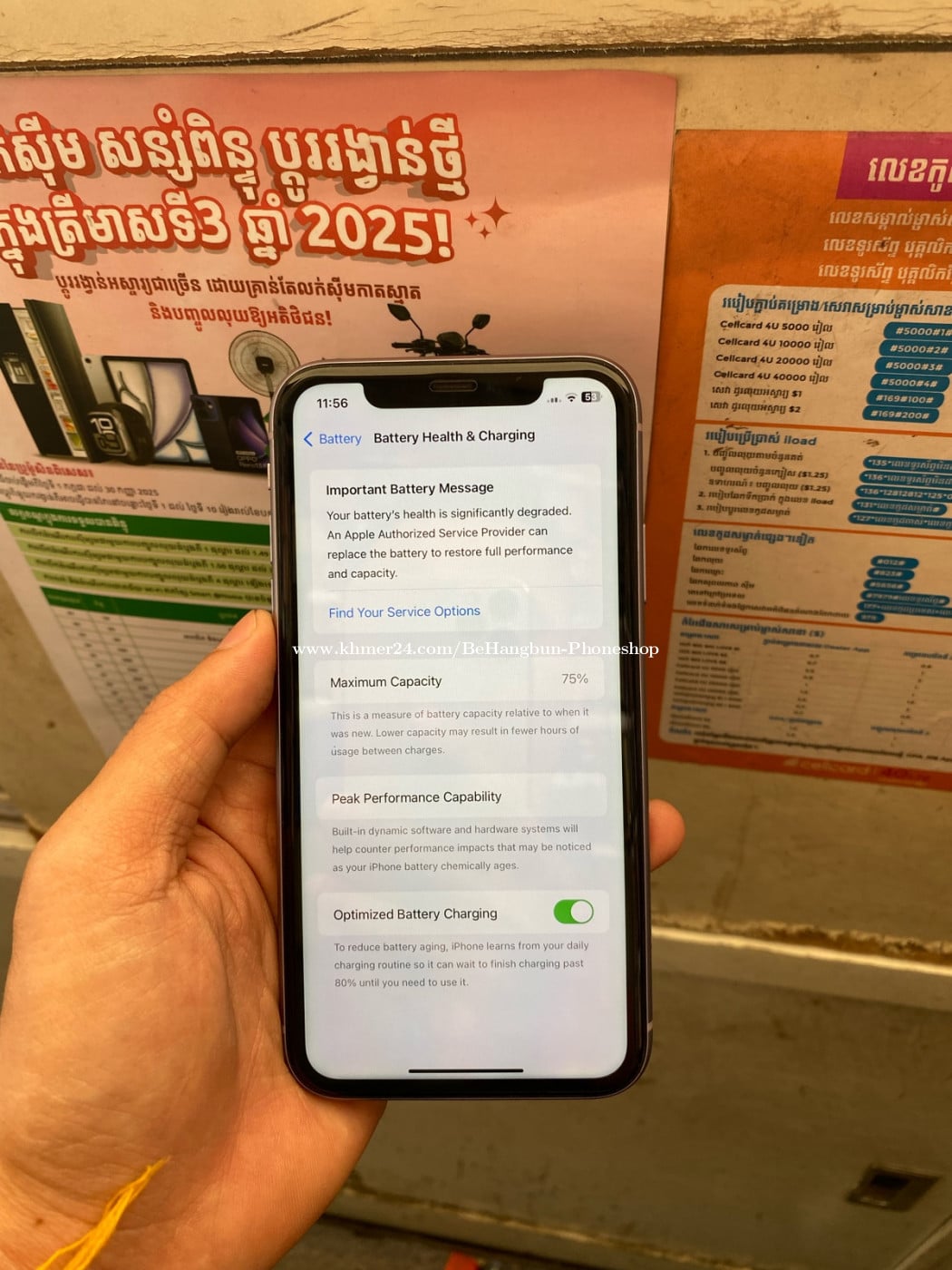 iPhone 11 64G មួយទឹកស្អាត98.99% មានស្កេន ធានាម៉ាសុីនហ្សុីន អេក្រង់ហ្សុីន នឹងធានាការប្រេីប្រាស់រយៈពេល15ថ្ងៃ មានឆ្នាំងសាក មានបង់រំលស់ជាមួយហាង មានសេវ៉ាដឹកជញ្ជូន25ខេត្ត-ក្រុង ទីតាំង : ជិតស្តុបលូប្រាំ ស្ទឹងមានជ័យ Tel : 099777xxxClick To Call / 081336xxxClick To Call / 0972312xxxClick To Call
