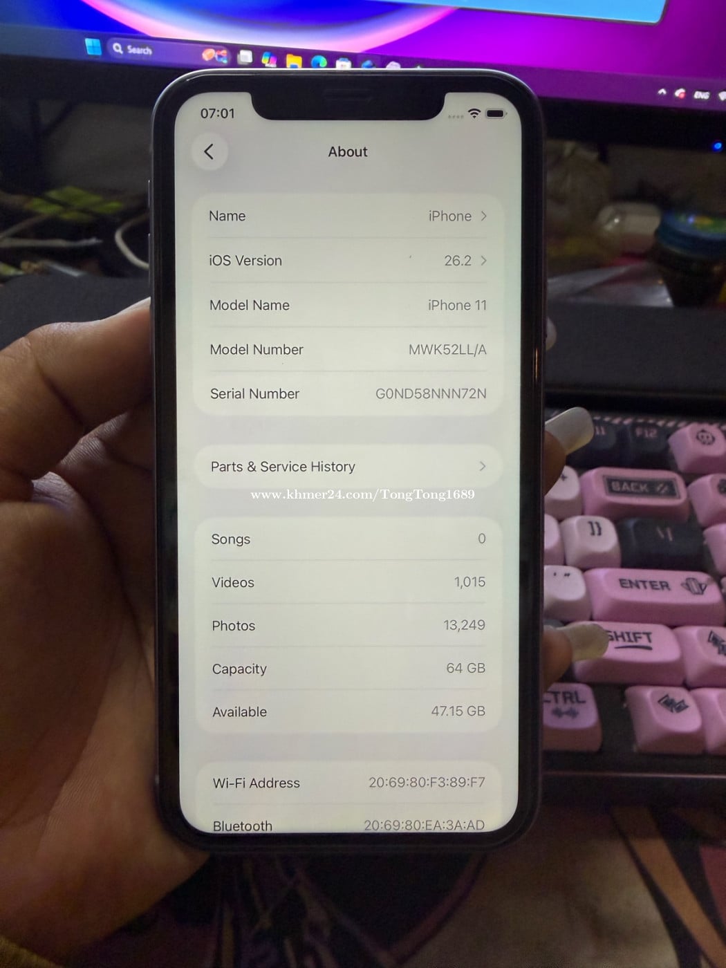 iPhone 11 64gb LL/A មាន Scan គុណភាព 98% ធ្លាប់ដូរថ្ម ( ថ្មគ្រប់អំព៉ែរ ) - ធានាជូន 1ខែ - ថែជូន ដំុសាក 20w + ខ្សែរសាក ( អត់យក - 5$ ) Type C - ប្រវត្តិ ( ធ្លាប់ដូរថ្ម ) ក្រៅពីរនឹងនៅ Zin ទាំងអស់ - នៅភ្នំពេញ Free ដឹក ( អាចមកមើលដល់ទីតាំងបាន នៅផ្សារទូលពង្រ ) ទំនាក់ទំនង Call / Telegram 0966653xxxClick To Call