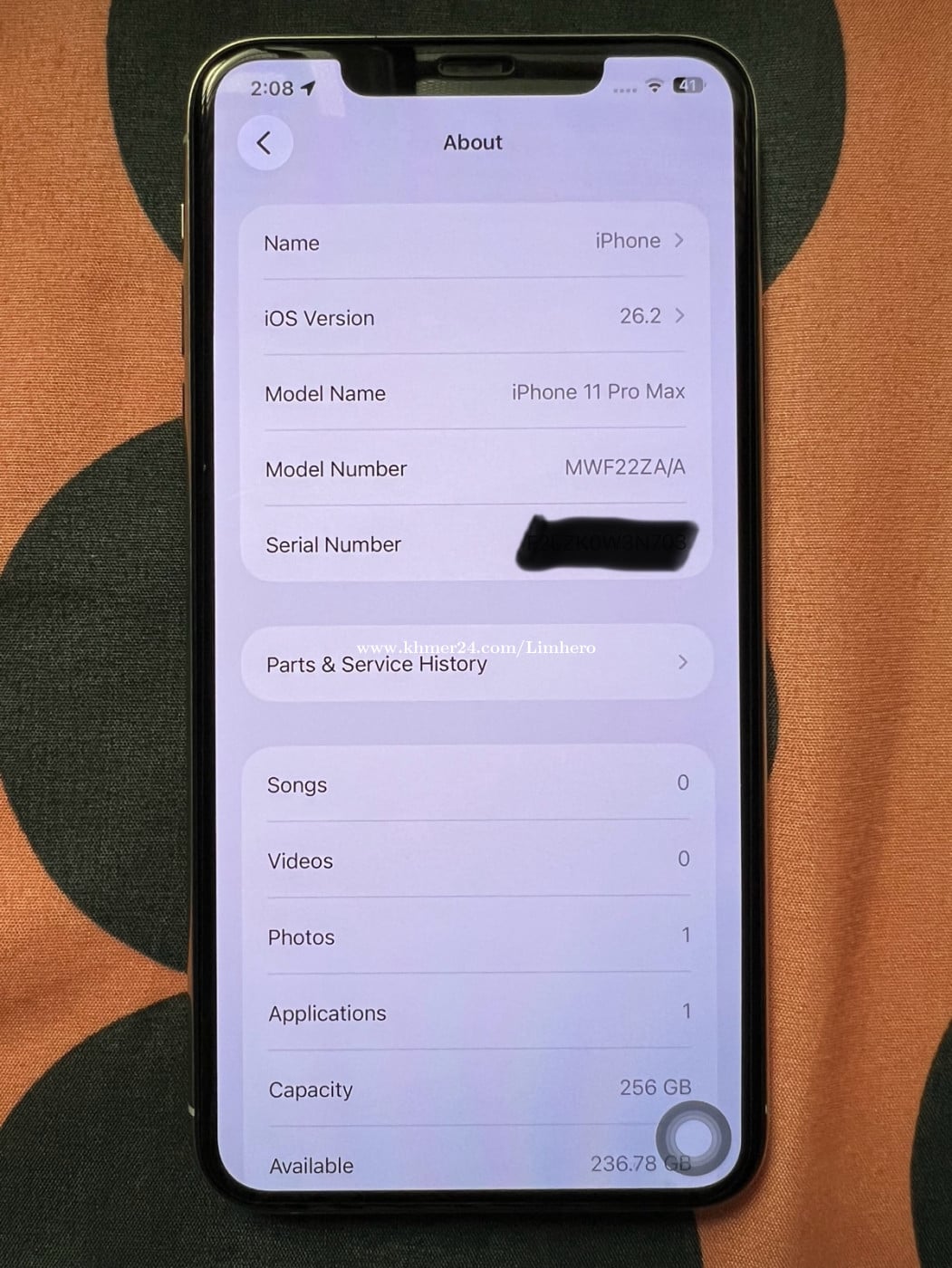 iPhone 11pro max 256g Z/A ស៊ីម 2 មានស្គេន មានដុំសាក និង ខ្សែសាក