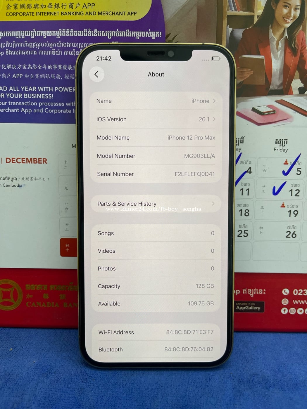 iPhone 12 Pro Max 128G LL តួ97% អេក្រង់ដូរស្រុីន ថ្ម86% តំលៃ 310$ 📍ទីតាំងចេនឡា តូប C1 24 ☎️012821xxxClick To Call Telegram 010646xxxClick To Call