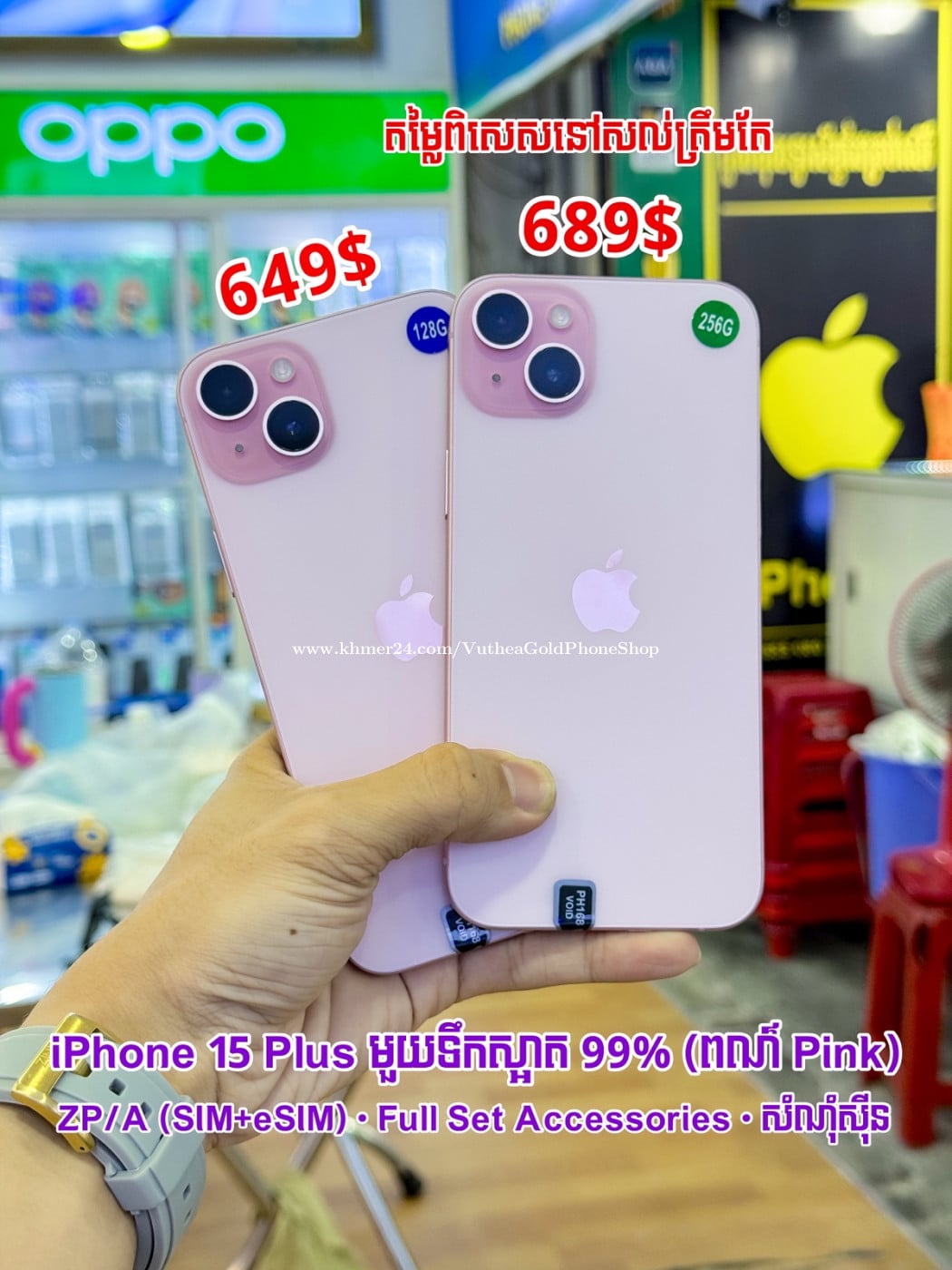 ✔️ iPhone 15 Plus ZP/A (SIM+eSIM) មួយទឹកស្អាត 99% ពណ៌ផ្កាឈូក Pink Pink • សំណុំស៉ីន 100% • Full Set Accessories ▪️128GB តម្លៃ 649$ | ▪️256GB តម្លៃ 689$ 📨 Telegram Chat: https://t.me/vutheagold