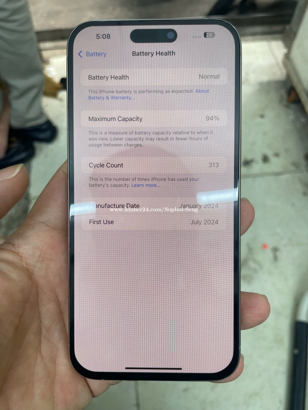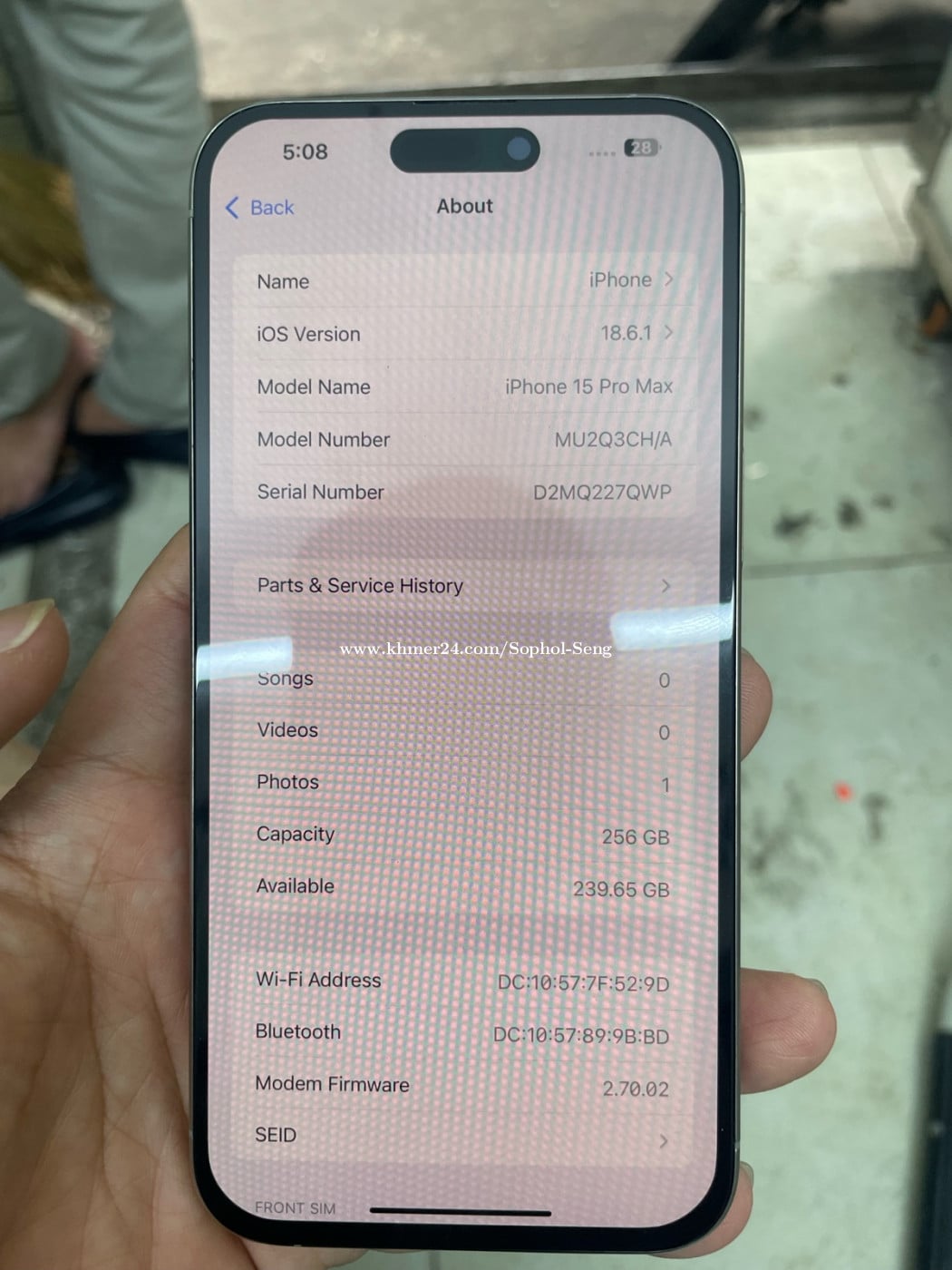Iphone 15 pro max 256G bypass wifibonly ម៉ាសុីនសាណុំហ្សុីន ប្ដូរតែអេក្រង់១មុខកត់ សុខភាពថ្មនៅខ្ពស់ 94% សាកបាន 313ដង បញ្ជាក់ LCD ថ្មី color ស្អាត ធានា1អាទិត្យ 010484xxxClick To Call ភ្នំពេញ