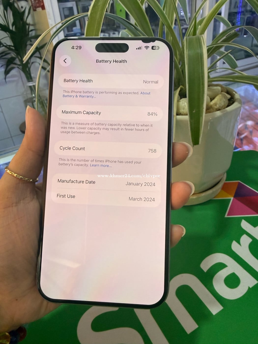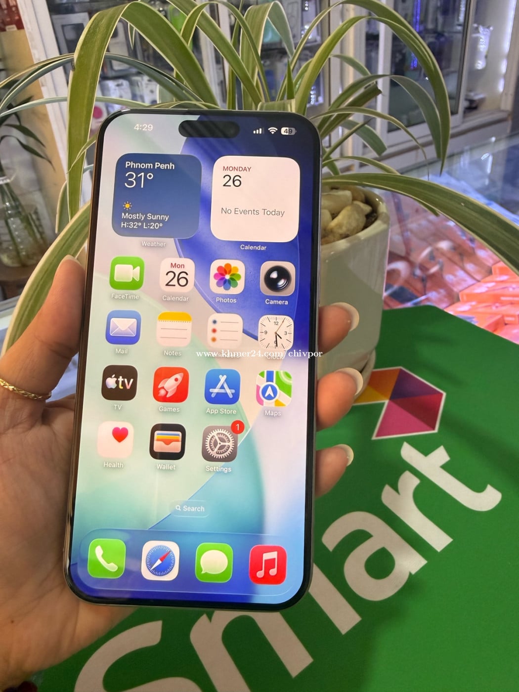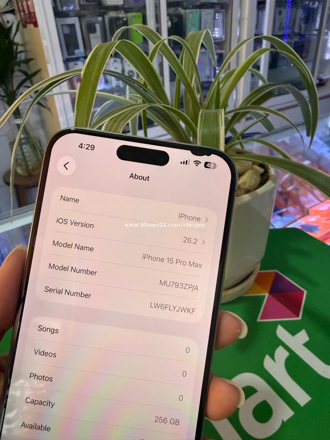 iPhone 15 promax 256gb ZP តួរស្អាត99% ដានខ្មៅអេក្រង់ខាងលេីបន្តិច ដូចរូប ម៉ាសុីនសុីន
