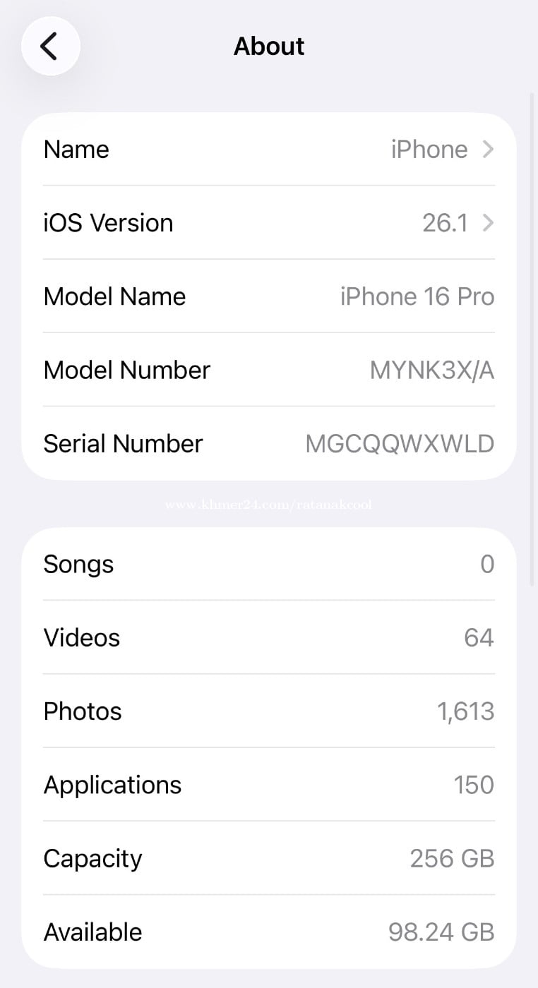ចង់លក់ទូរស័ព្ទប្រេីផ្ទាល់ខ្លួន ព្រោះចង់ប្ដូរស៊េរី iPhone 16 Pro X/A 256G នៅស្អាតខ្ចីញ៉េញ 99.99% ថ្មនៅ (Battery health) 100%