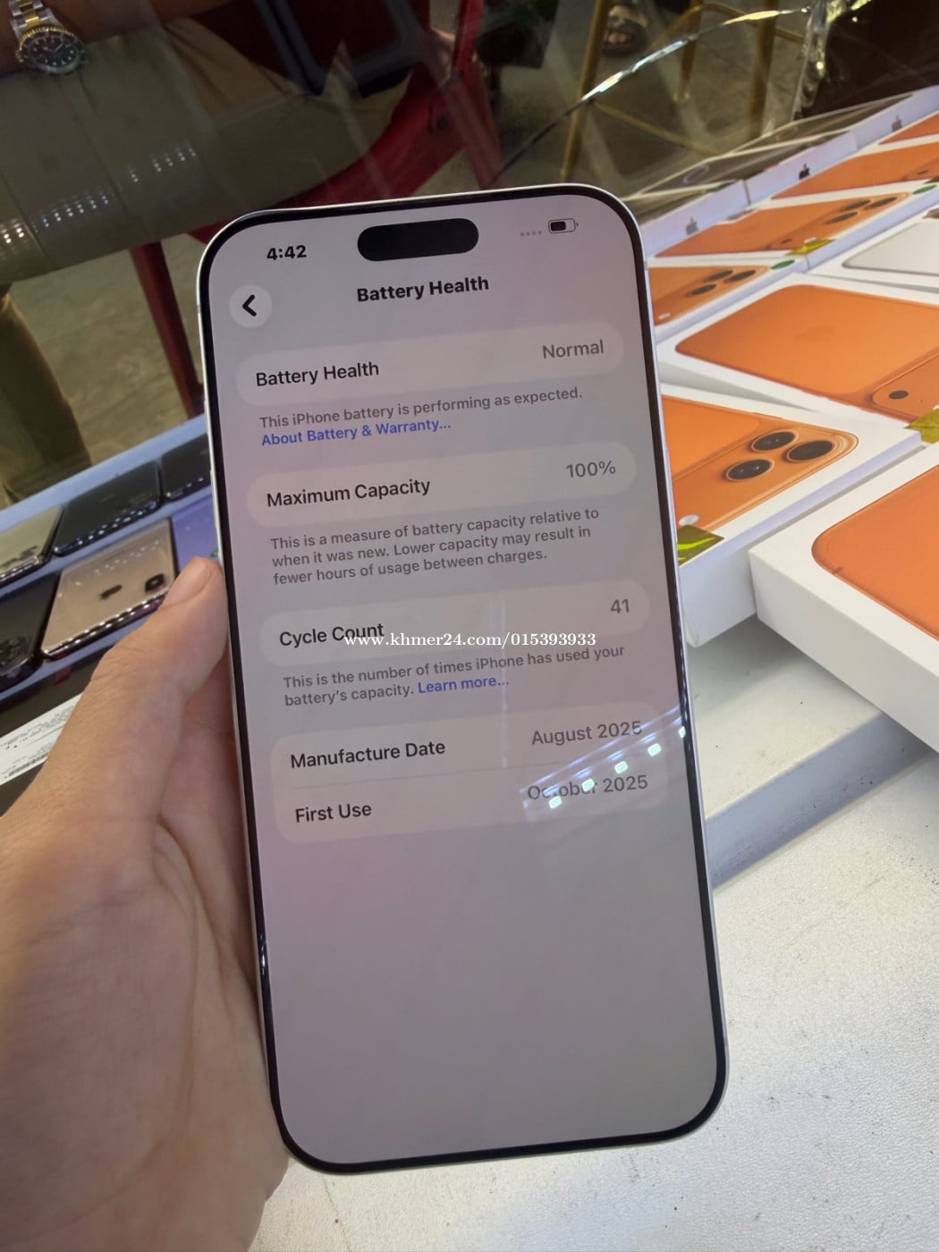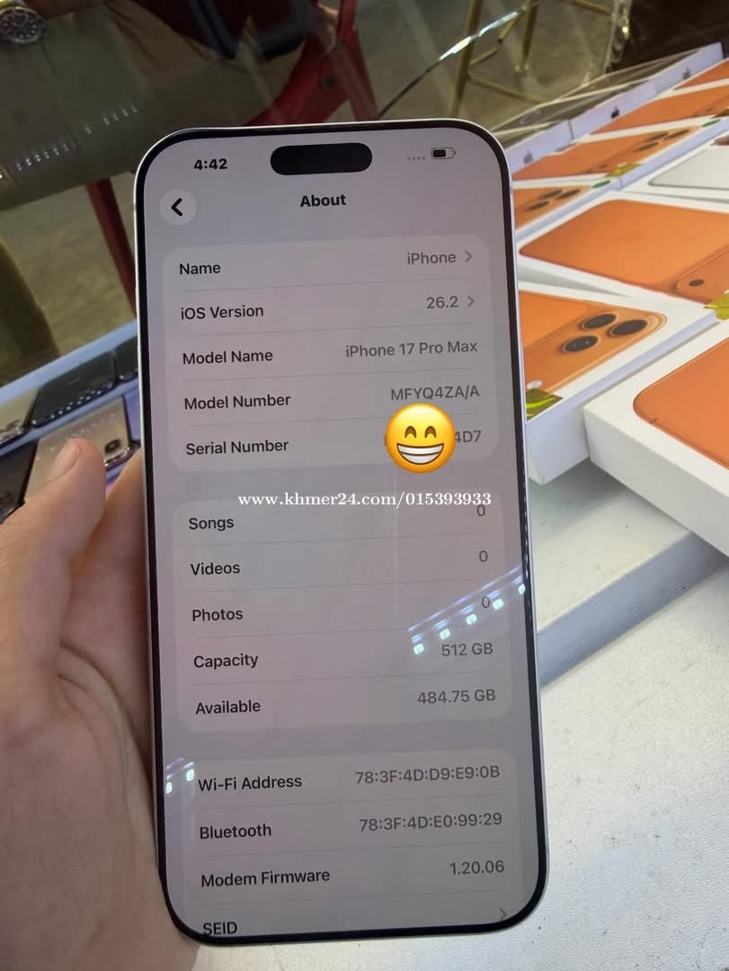 iPhone 17 Pro Max, ZA/A 512GB, ថ្ម100% សេី្ទរដូចក្នុងរូប .លក់: 1400$ .មានបង់រំលស់: មាន750$យកទៅប្រេីបាន .Free: ឆ្នាំងសាក, Case, Screen .ទីតាំង: នៅផ្សារបូរីពិភពថ្មីចំការដូង1 .Tel: 078343xxxClick To Call,015393xxxClick To Call