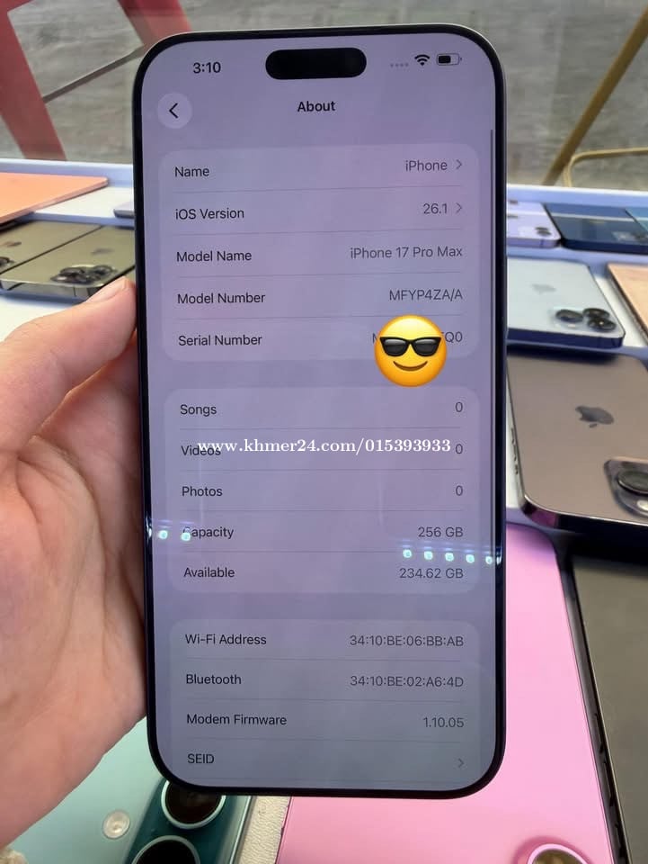 iPhone 17 Pro Max Dark Blue, 256GB ZA/A, ថ្ម100% .លក់: 1230$, ស្អាត 98.99% .មានបង់រំលស់: មាន650$-700$យកទៅប្រេីបាន .Free: ឆ្នាំងសាក, Case, Screen .ទីតាំង: នៅផ្សារបូរីពិភពថ្មីចំការដូង1 .Tel: 078343xxxClick To Call,015393xxxClick To Call