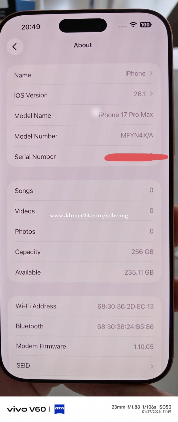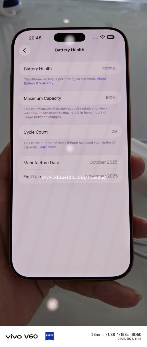 iPhone 17 Pro Max X/A ធានា 2 ឆ្នាំ សាកថ្ម 29 ដង