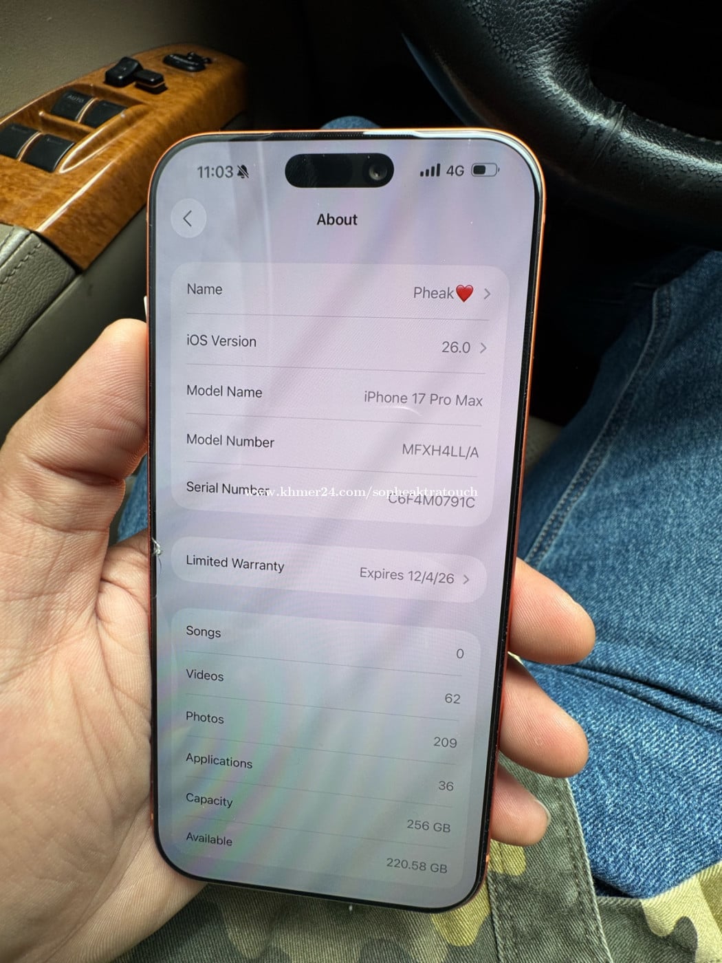 iPhone 17 Promax LL256G សាកថ្មបាន5 ដង original all part នៅwarranty ពីហាង គ្មានស្នាម នៅស្អាតទាំងអស់ ខ្សែសាកសុីន ទីតាំង ច្បាអំពៅ 010547xxxClick To Call