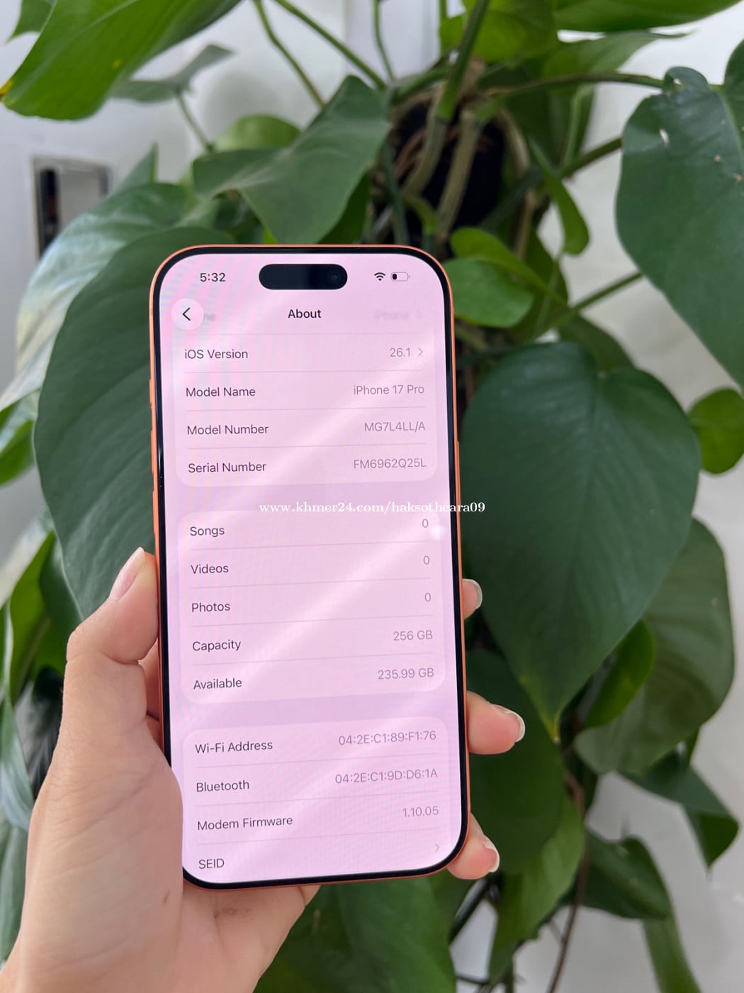 iPhone 17pro 256g LL/A សុំណុំសុីន ស្អាត99% តម្លៃ 1040$ 🍊🥰