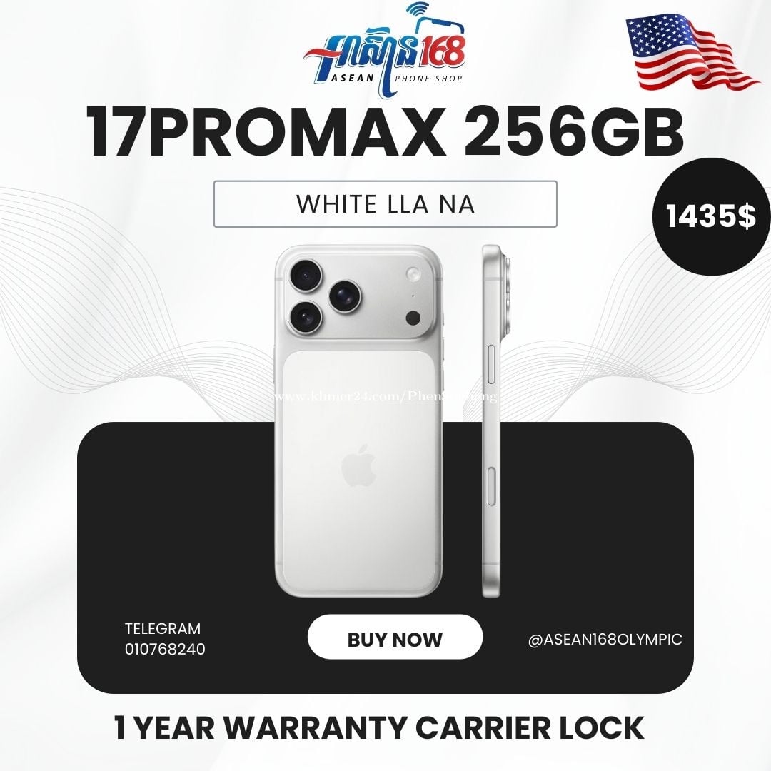 iPhone 17ProMax White LLA NA 1 Month Warranty ON Machine 1 Year Warranty ON Carrier Lock -------------------------- 010768xxxClick To Call/078446xxxClick To Call 8AM-9PM Channel Telegram https://t.me/Asean168Olympic Telegram https://t.me/+85510768240 ------------------------- អាសយដ្ឋាន៖ ផ្ទះលេខ 99 ផ្លូវ 199 កែង318 ក្បែរវីរៈប៊ុនថាំអូរឡាំពិច