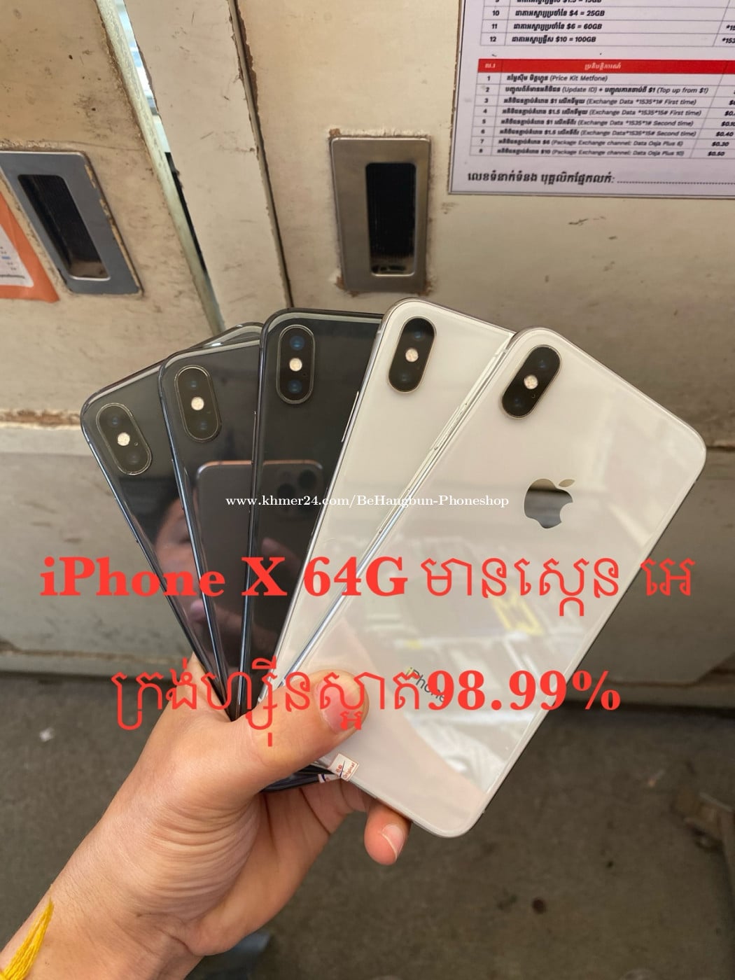 iPhone X 64G មួយទឹកស្អាត98.99% មានស្កេន ធានាម៉ាសុីនហ្សុីន អេក្រង់ហ្សុីន នឹងធានាការប្រេីប្រាស់រយៈពេល15ថ្ងៃ មានឆ្នាំងសាក មានបង់រំលស់ជាមួយហាង មានសេវ៉ាដឹកជញ្ជូន25ខេត្ត-ក្រុង ទីតាំង : ជិតស្តុបលូប្រាំ ស្ទឹងមានជ័យ Tel : 099777xxxClick To Call / 081336xxxClick To Call / 0972312xxxClick To Call