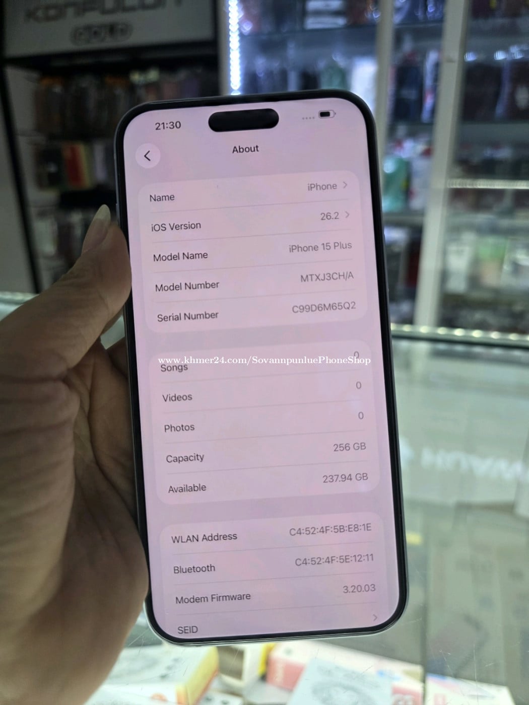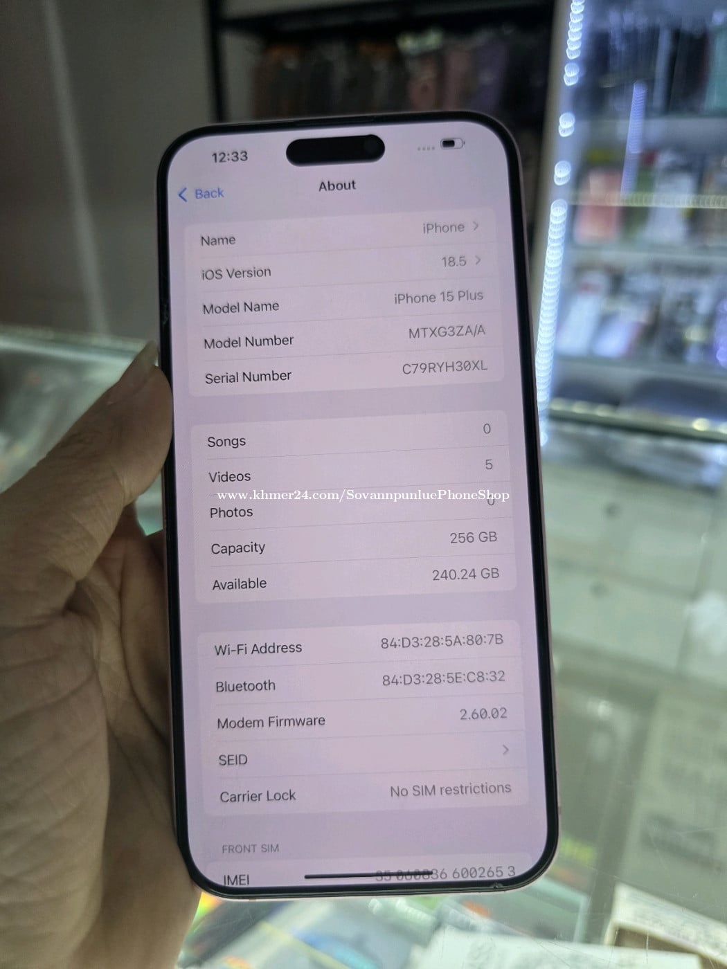 Iphone15plus 256G sim2 ZA ថ្ម88%នឹង Ch ថ្ម92% ស្អាត99%ធានាសុំនុំហ្សីន ថ្មធំ internet លឿនលេងអត់ក្តៅ បើមិនជឿសាក បងប្អូនណាចាប់អារម្មណ៍មាននៅហាងពេជ្រសុវណ្ណពន្លឺ នឹងហាងសុវណ្ណឧត្តម tel: 081335xxxClick To Call/ 017553xxxClick To Call
