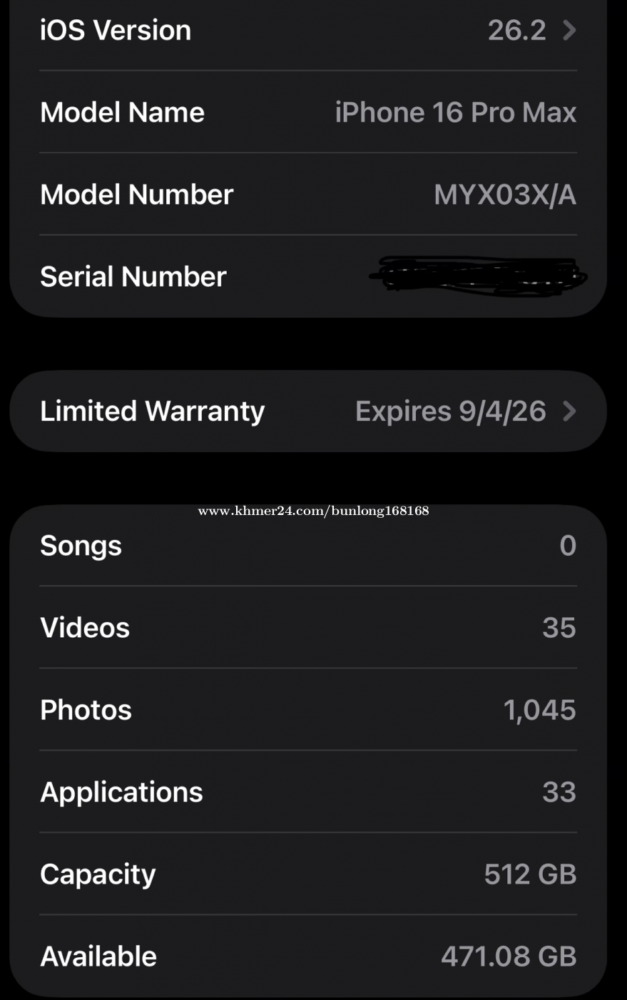 ទូរសព្ទ័ទិញមកថ្មីប្រអប់ កូដ XA ធានាក្រុមហ៊ុន 1 ឆ្នាំទេីបទិញបាន 2 ខែជាង នៅដូចថ្មី ខ្ចីថ្ម100% សាកថ្មរបាន70 ដងជាង មានប្រអប់ ខ្សែសាក Full Set ។ អាចវៃដូ ជាមួយ iPhone 17 Pro max បាន បើចាប់អារម្មណ៍អាចទាក់ទងបាន អរគុណ។