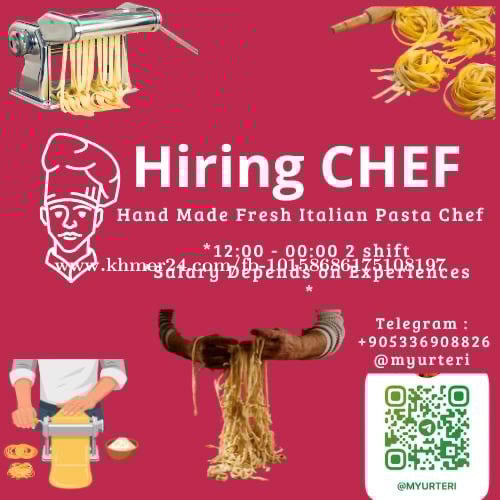 Hi Everyone We are HIRING CHEF – Handmade Fresh Italian Pasta Chef Proven experience as Chef Exceptional proven ability of kitchen management Quickly learning masterclass training Experience making fresh pasta Flexible working hours High responsibility Operation result–driven Salary Depends on Experience 2 Chef - 2 sifting Salary depends experience 200-300 dollars Location: Phnom Penh, Cambodia Telegram : @myurteri | +90 5336908xxxClick To Call Smart : +8558788xxxClick To Call5 សួស្តីអ្នកទាំងអស់គ្នា យើងខ្ញុំកំពុងជ្រើសរើសមេចុងភៅ - មេចុងភៅប៉ាស្តាអ៊ីតាលីស្រស់ៗធ្វើដោយដៃ English speaking is advantage មានបទពិសោធន៍ជាមេចុងភៅដែលបង្ហាញឱ្យឃើញ សមត្ថភាពគ្រប់គ្រងផ្ទះបាយដ៏ល្អឥតខ្ចោះ រៀនវគ្គបណ្តុះបណ្តាលថ្នាក់មេយ៉ាងរហ័ស មានបទពិសោធន៍ធ្វើប៉ាស្តាស្រស់ៗ ម៉ោងធ្វើការបត់បែន ទំនួលខុសត្រូវខ្ពស់ ប្រតិបត្តិការផ្តោតលើលទ្ធផល ប្រាក់ខែអាស្រ័យលើបទពិសោធន៍ មេចុងភៅ 2 នាក់ - រើស 2 នាក់ Location: Phnom Penh, Cambodia Telegram : @myurteri | +90 5336908xxxClick To Call Smart : +8558788xxxClick To Call5
