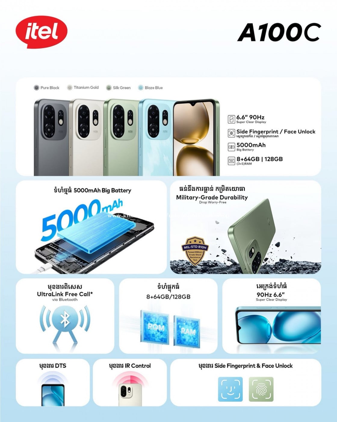 #A100C មកដល់ហើយ ជាមួយរូបរាងថ្មី 🔥 * អេក្រង់: 𝟲.𝟲" 𝟵𝟬𝗛𝘇 𝗦𝘂𝗽𝗲𝗿 𝗖𝗹𝗲𝗮𝗿 𝗗𝗶𝘀𝗽𝗹𝗮𝘆 * ទំហំថ្ម: 𝟱𝟬𝟬𝟬𝗺𝗔𝗵 𝗕𝗶𝗴 𝗕𝗮𝘁𝘁𝗲𝗿𝘆 * 𝗦𝗶𝗱𝗲 𝗙𝗶𝗻𝗴𝗲𝗿𝗽𝗿𝗶𝗻𝘁 + 𝗙𝗮𝗰𝗲 𝗨𝗻𝗹𝗼𝗰𝗸 *𝙐𝙡𝙩𝙧𝙖𝙇𝙞𝙣𝙠 𝙁𝙧𝙚𝙚 𝘾𝙖𝙡𝙡 𝙁𝙧𝙚𝙚𝘾𝙤𝙣𝙣𝙚𝙘𝙩𝙞𝙤𝙣 𝙫𝙖𝙞 𝘽𝙡𝙪𝙚𝙩𝙤𝙤𝙩𝙝 🔥RAM: (3+5)8GB+64GB 69$ 🔥RAM: (3+5)8GB+128GB 79$ - - - - - - - - - - - - #itelmobile #itelmobilecambodia #itelA100C #comingsoon #mobilephone