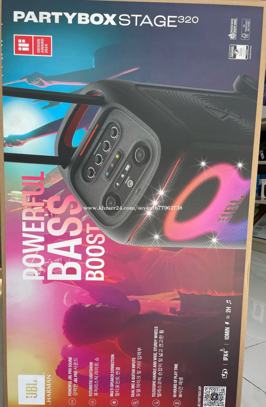 🔊 Powerful JBL Pro Sound • សំឡេងខ្លាំង ច្បាស់ និងបាសធំៗសម្រាប់កម្មវិធី/Party • 💥 Powerful Bass Boost • បង្កើនបាសឲ្យបុកខ្លាំង (Bass Boost) សម្រាប់ភ្លេង EDM / Remix / DJ • 🌈 Futuristic Lightshow • ភ្លើង LED បែបពិសេស (Light show) លេងតាមបទភ្លេង បង្កើតអារម្មណ៍ Party • 🔗 Multi-speaker Connection • អាចភ្ជាប់ speaker ច្រើនគ្រឿងជាមួយគ្នា ដើម្បីបង្កើនសម្លេងឲ្យធំជាងមុន • 🎤🎸 Dual Mic & Guitar Inputs • មានរន្ធចាក់ Mic 2 + Guitar • សាកសមសម្រាប់ Karaoke / ច្រៀងផ្ទាល់ / លេង Guitar • 🧳 Telescopic Handle + Wide Sturdy Wheels • មានដៃទាញ (Telescopic handle) និងកង់ធំរឹងមាំ • ងាយអូសយកទៅក្រៅ/ដឹកជញ្ជូន • 🔋 18 Hours of Playtime • ថ្មប្រើបានប្រហែល 18 ម៉ោង (អាស្រ័យលើកម្រិតសម្លេង និងភ្លើង) • 💦 IPX4 Splashproof • ធន់ទឹកបាញ់/ទឹកជ្រាបតិចៗ (ប្រើក្រៅផ្ទះបាន) • 📡 Wireless • ភ្ជាប់ Bluetooth ចាក់ភ្លេងពីទូរស័ព្ទ/Tablet ងាយស្រួល • 🎛️ Control Panel / EQ • មានប៊ូតុងកែសំឡេង (Bass/Treble/Echo…) សម្រាប់ការច្រៀង និងភ្លេង