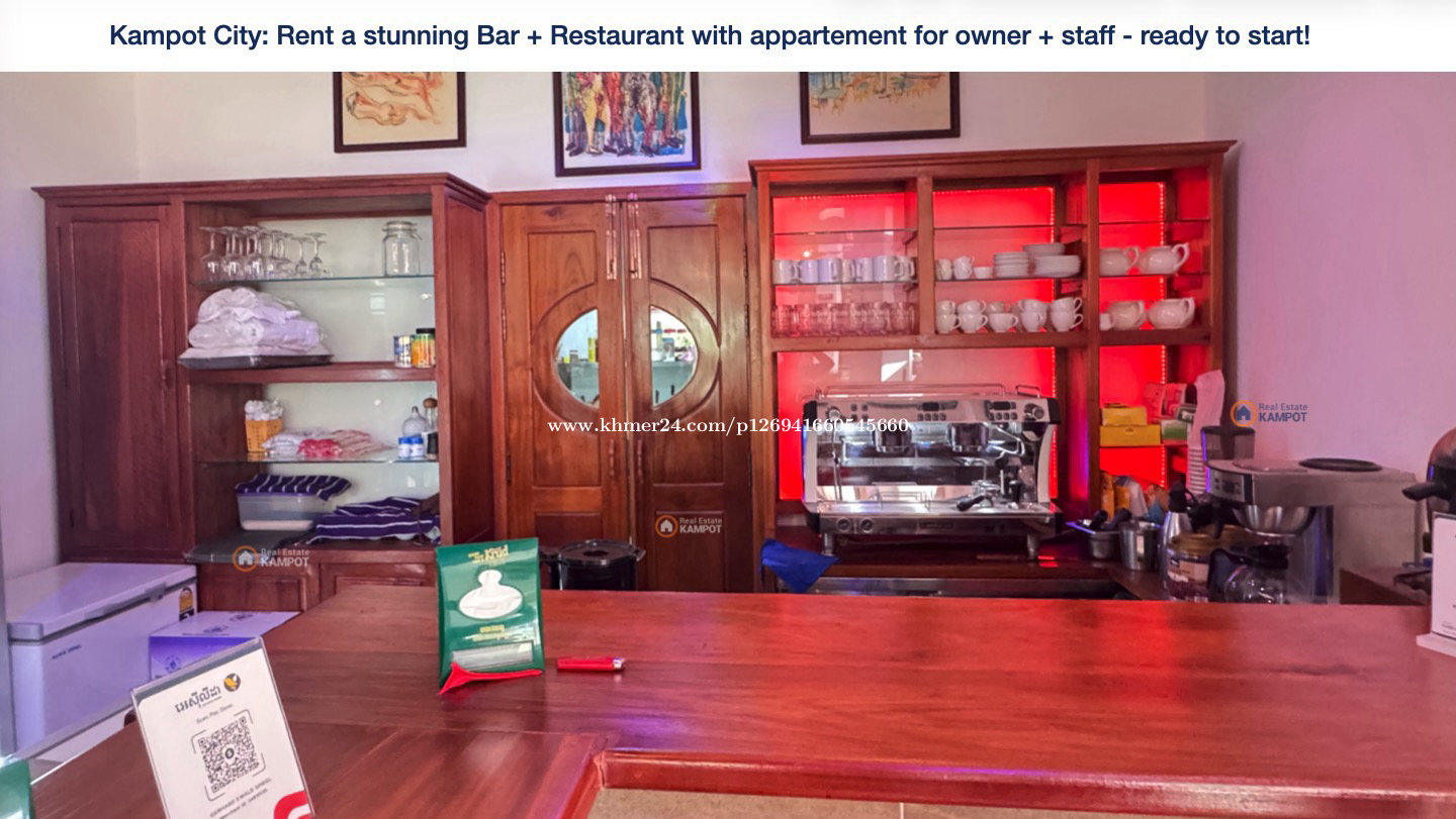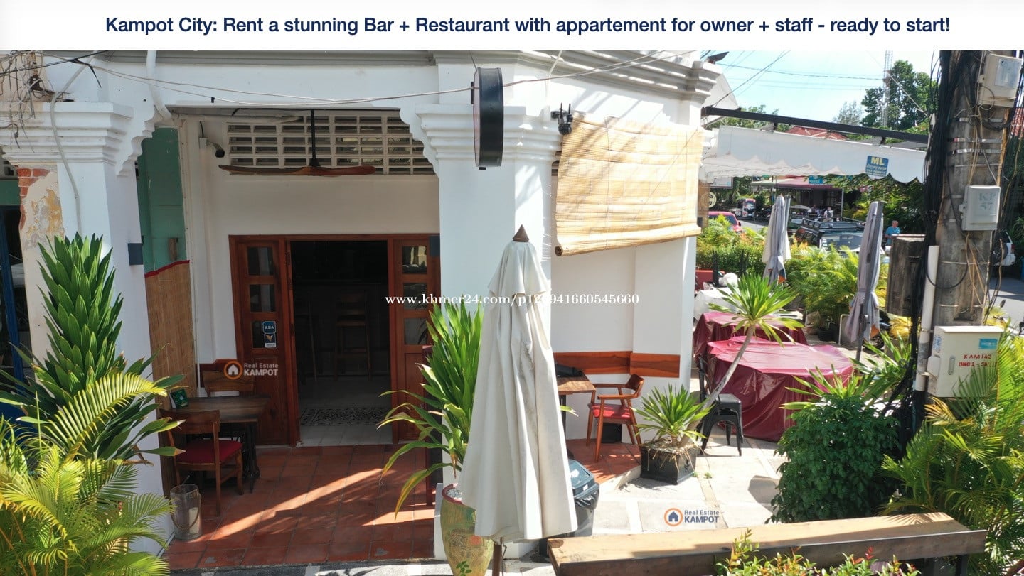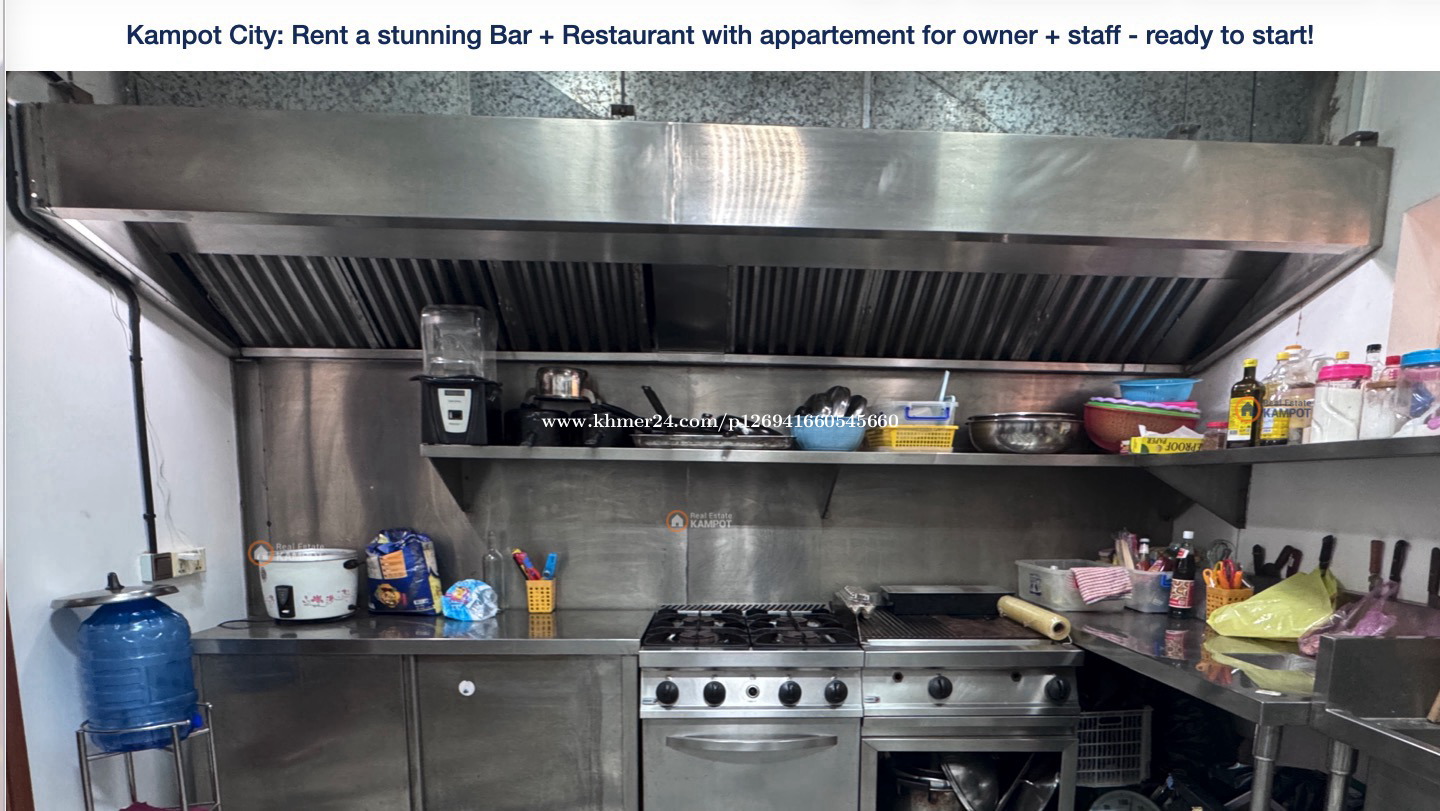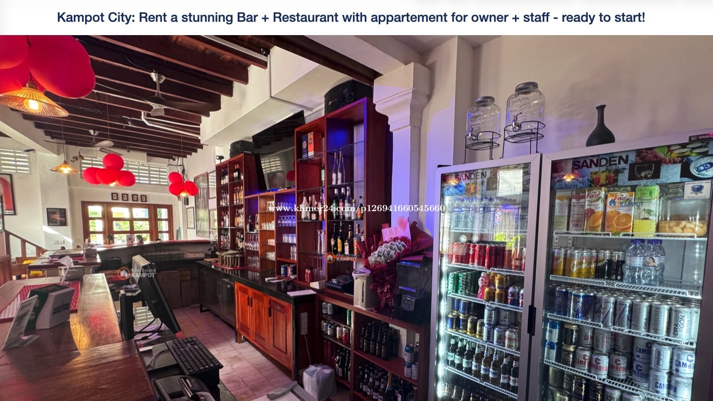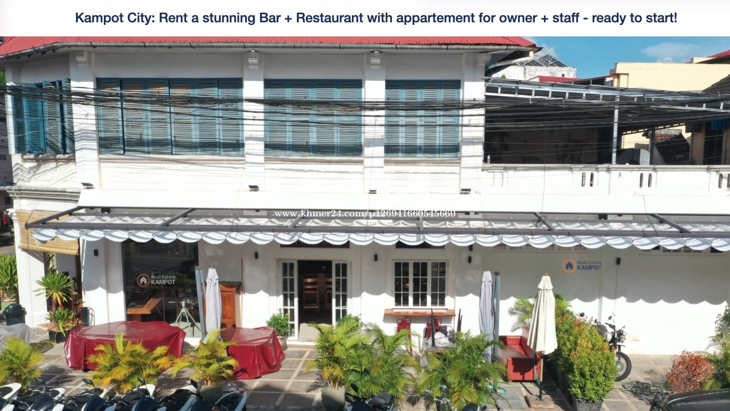 Rent a ready to start new business at the city of Kampot, directly at the favorite tourist area! The Restaurant an Bar has a really new high quality interieur, kitchen and all tools you need for a successful business. In Addition at the 1 floor you have more space for a high outside terrace or 2 appartements. Furthermore the Restaurant and Bar is listed on Facebook and Google, start now your own business. Inside Bar Restaurant (size 78 sqm) - Bar counter with 11 places and 16 bar stools (wood) - Standing table - Tables with 8 chairs Outside terrace (size 120 sqm) - 30 seating places (each set includes 6 tables for 4 people and 2 small tables for 2 people.) - Billiard table - Parasols (3 huge, 2 small) - Bar and Restaurant equipment - Glasses, plates, cutlery - Large refrigerators - Freezer - Dishwasher - POS system - Big fully automatic coffee machine - Kitchen (size 20 sqm) - Large gas stove - Pots, pans, kitchen utensils - washing machine Additional technic - WiFi - Security – camera system ( 6 pieces) - Indoor and outdoor sound system - 2 large UHD TVs (1 inside, 1 for outside) - License for TV paid - Laser for outdoor light effects Appartements -2- (big appartement size 26 sqm and 1 appartement 20 sqm) Contracting - 4-year lease contract - Deposit 8.000 $ Phone: 0978312xxxClick To Call Telegram: https://t.me/RealEstateKampot Whats App https://wa.me/+855978312694?text=Hello%20there Web + location: https://realestatekampot.com