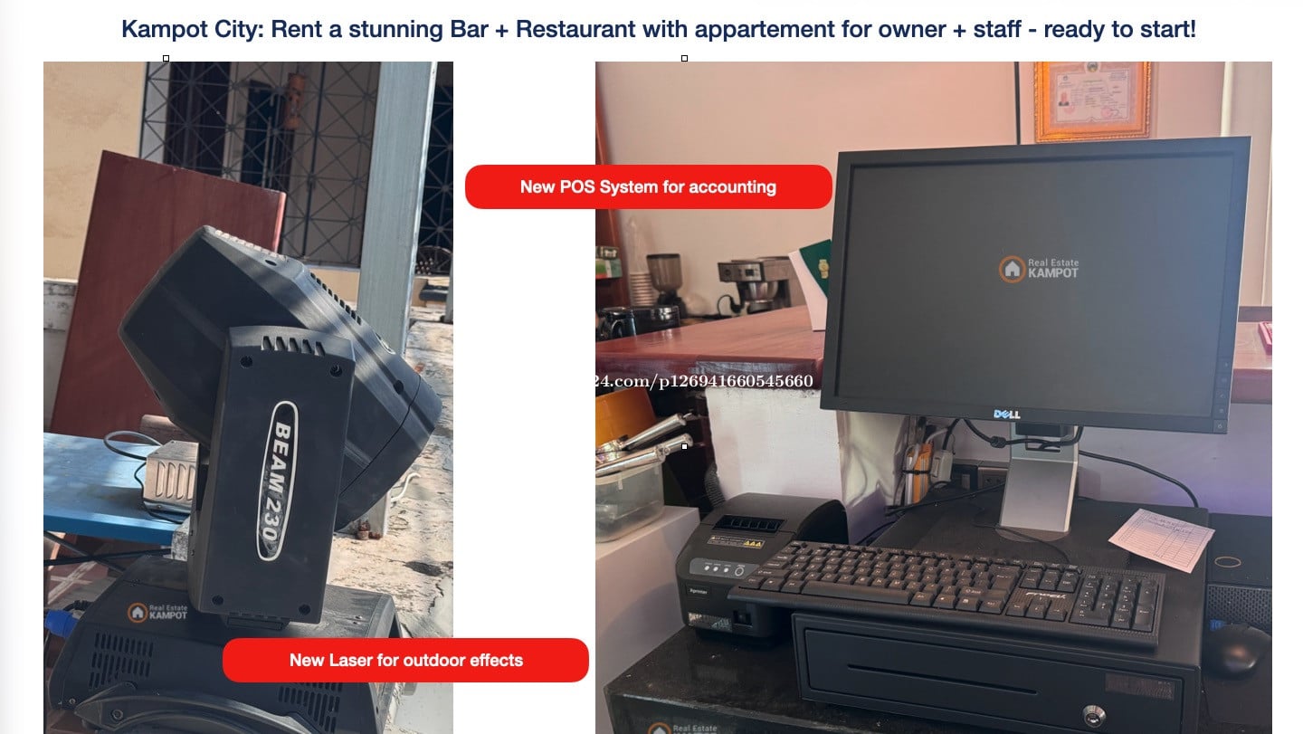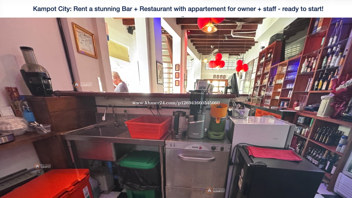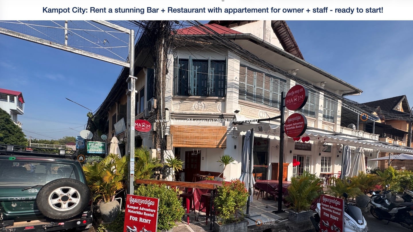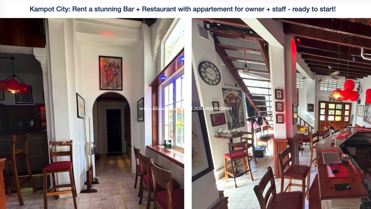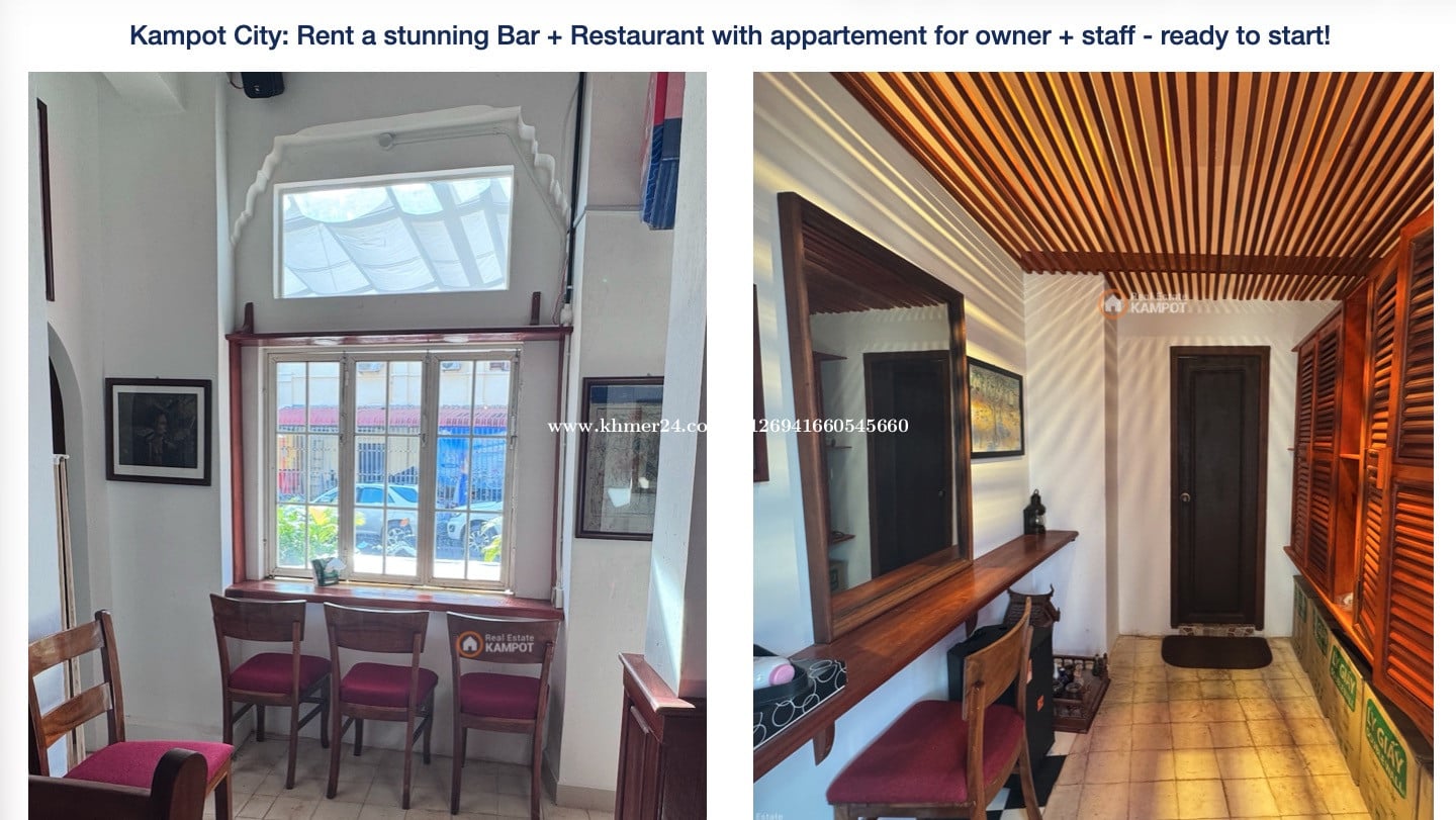 Rent a ready to start new business at the city of Kampot, directly at the favorite tourist area! The Restaurant an Bar has a really new high quality interieur, kitchen and all tools you need for a successful business. In Addition at the 1 floor you have more space for a high outside terrace or 2 appartements. Furthermore the Restaurant and Bar is listed on Facebook and Google, start now your own business. Inside Bar Restaurant (size 78 sqm) - Bar counter with 11 places and 16 bar stools (wood) - Standing table - Tables with 8 chairs Outside terrace (size 120 sqm) - 30 seating places (each set includes 6 tables for 4 people and 2 small tables for 2 people.) - Billiard table - Parasols (3 huge, 2 small) - Bar and Restaurant equipment - Glasses, plates, cutlery - Large refrigerators - Freezer - Dishwasher - POS system - Big fully automatic coffee machine - Kitchen (size 20 sqm) - Large gas stove - Pots, pans, kitchen utensils - washing machine Additional technic - WiFi - Security – camera system ( 6 pieces) - Indoor and outdoor sound system - 2 large UHD TVs (1 inside, 1 for outside) - License for TV paid - Laser for outdoor light effects Appartements -2- (big appartement size 26 sqm and 1 appartement 20 sqm) Contracting - 4-year lease contract - Deposit 8.000 $ Phone: 0978312xxxClick To Call Telegram: https://t.me/RealEstateKampot Whats App https://wa.me/+855978312694?text=Hello%20there Web + location: https://realestatekampot.com