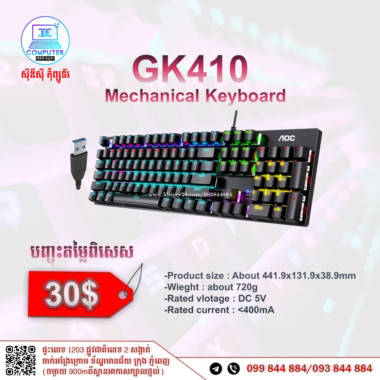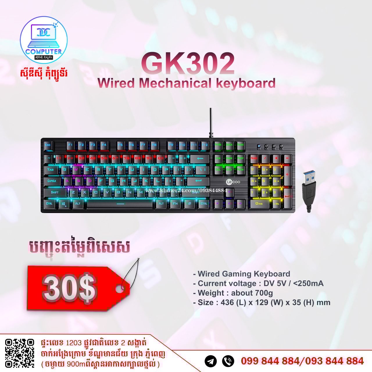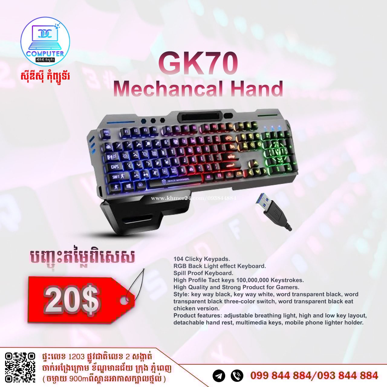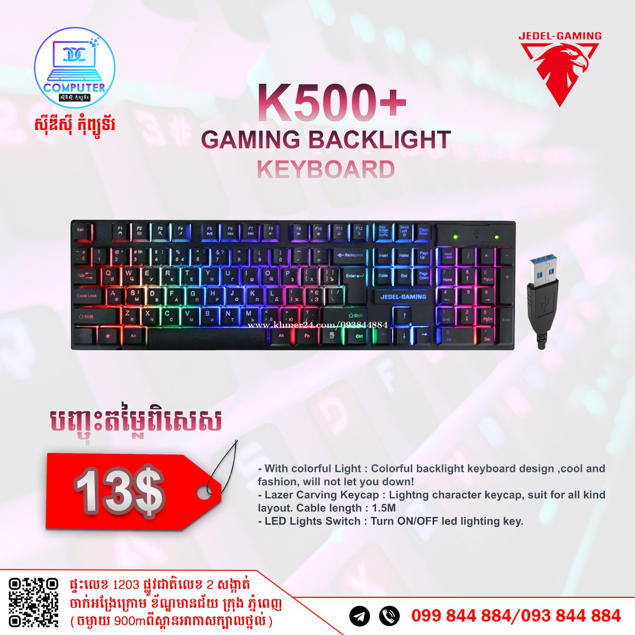 Keyboard USB Normal and Gaming មានច្រើនជម្រើស តម្លៃល្អ ! 💯 អតិថិជនអាចអញ្ញើញមកផ្ទាល់ដល់ទីតាំងហាងបានទំនិញមានស្រាប់មិនបាច់រង់ចាំយូរ ! ☎️ទូរស័ព្ទលេខ : 093844xxxClick To Call / 099844xxxClick To Call 📬Telegram : t.me/CDCCOMPUTER093 🏠ទីតាំងហាង : ផ្ទះលេខ 1203 ផ្លូវជាតិលេខ2 , ចាក់អង្រែលើ , ខ័ណ្ឌមានជ័យ , ភ្នំពេញ ( ចំងាយ 900m ពីស្ពានអាកាសក្បាលថ្នល់ ) 📍 Google map : https://maps.app.goo.gl/R3W9thPP5omgsMaZA