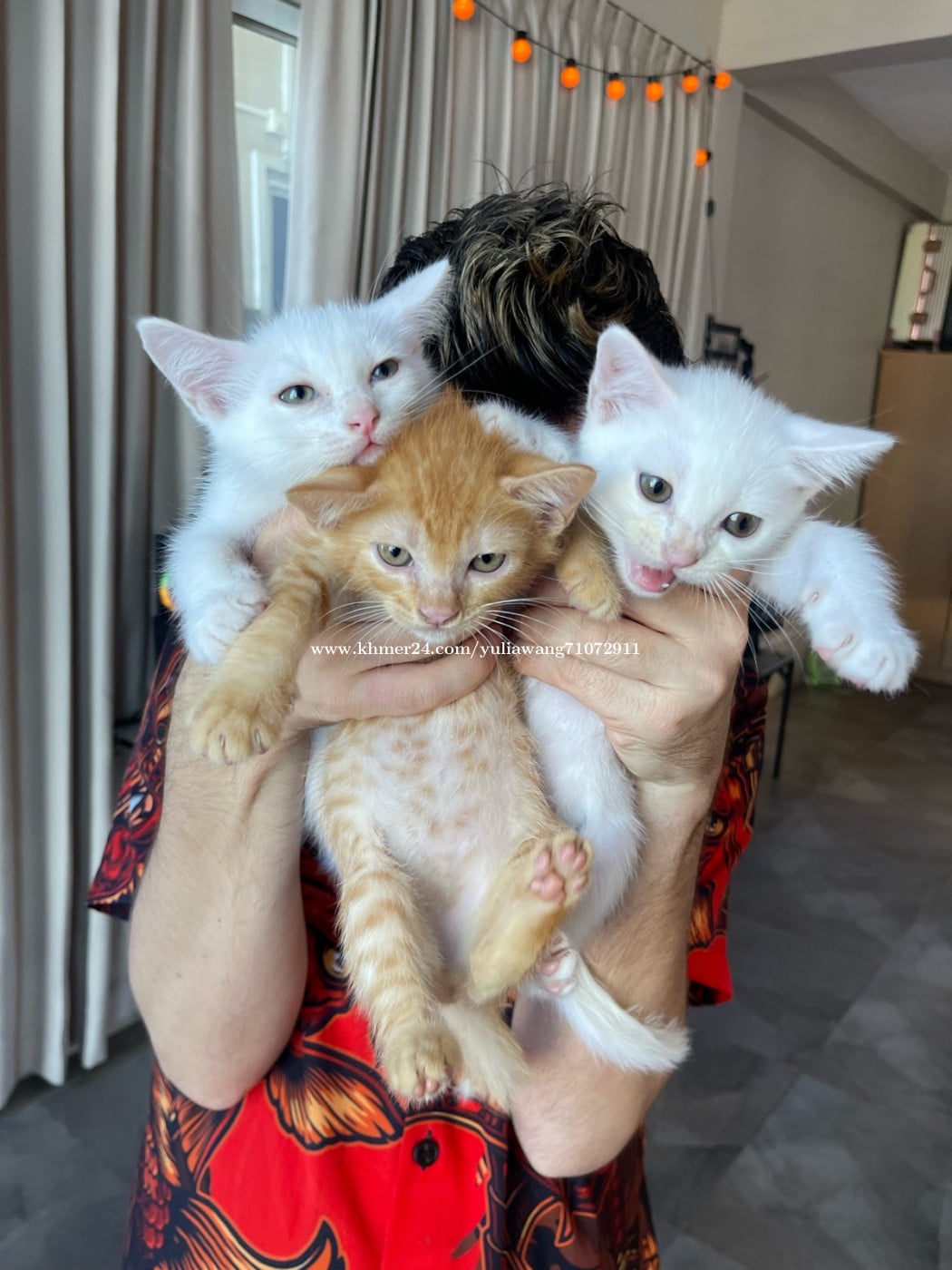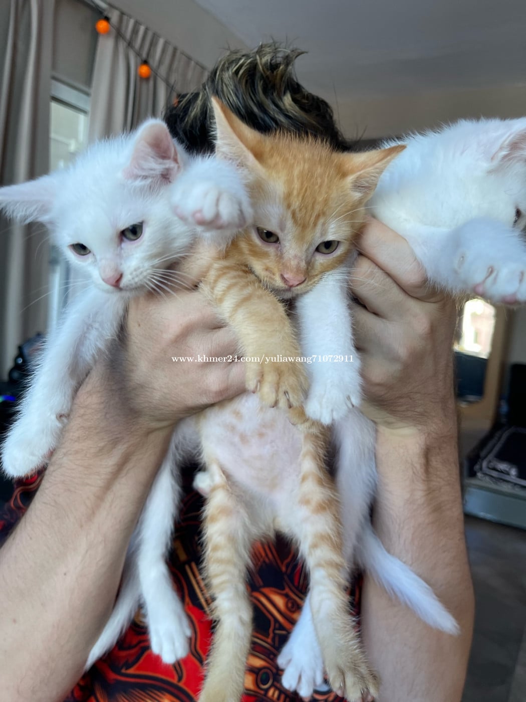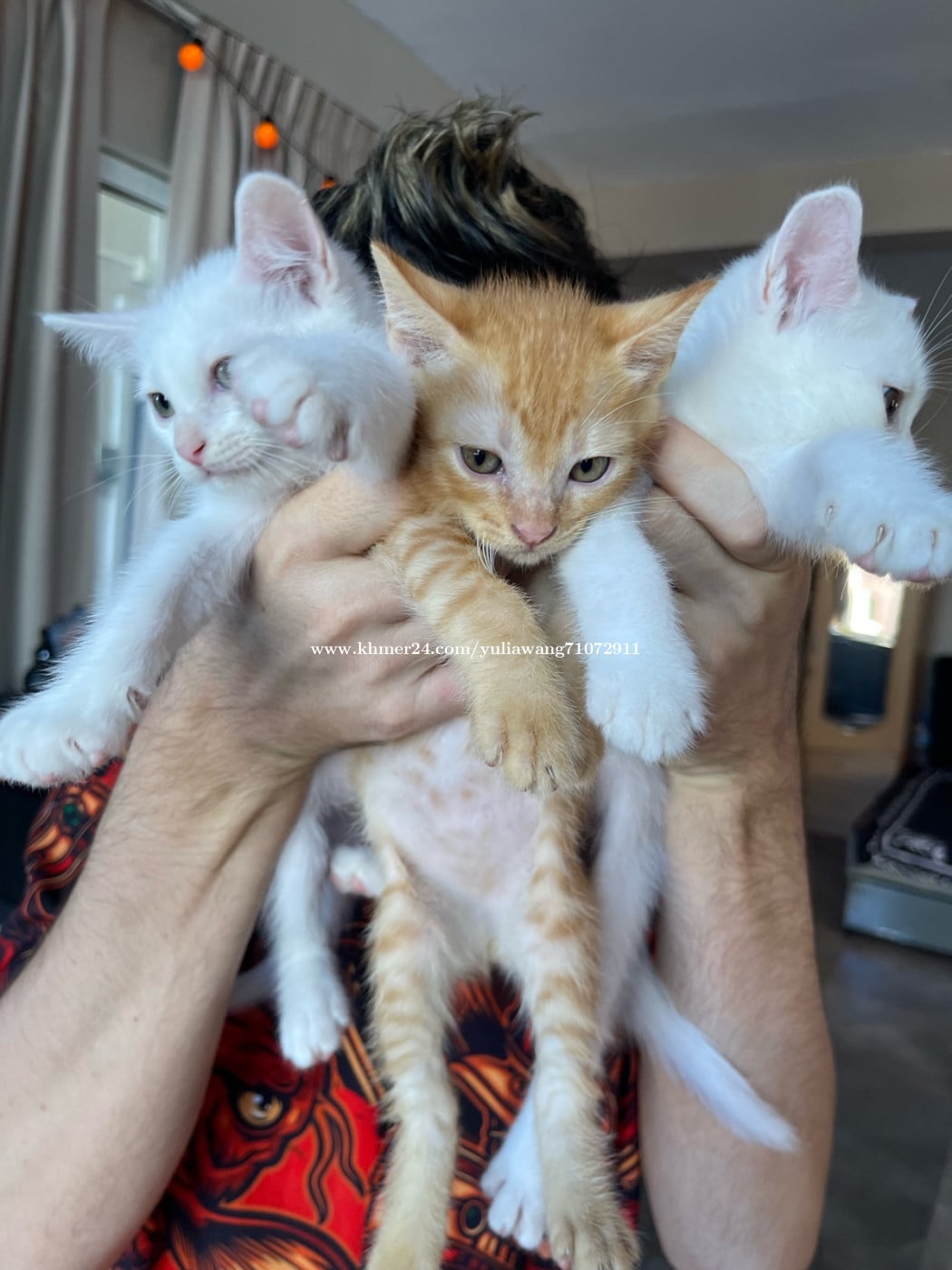 2 White kitties Khao Manee (one boy and one girls) Orange kitty - Arabian MAU From same white mother. Can eat food and can drink water and milk. Age 45 days.