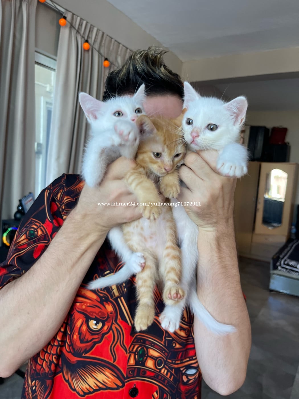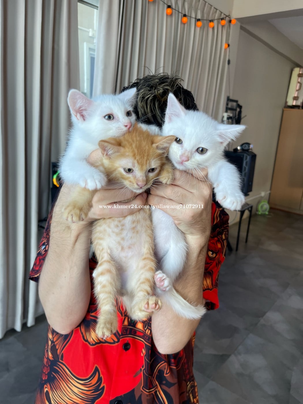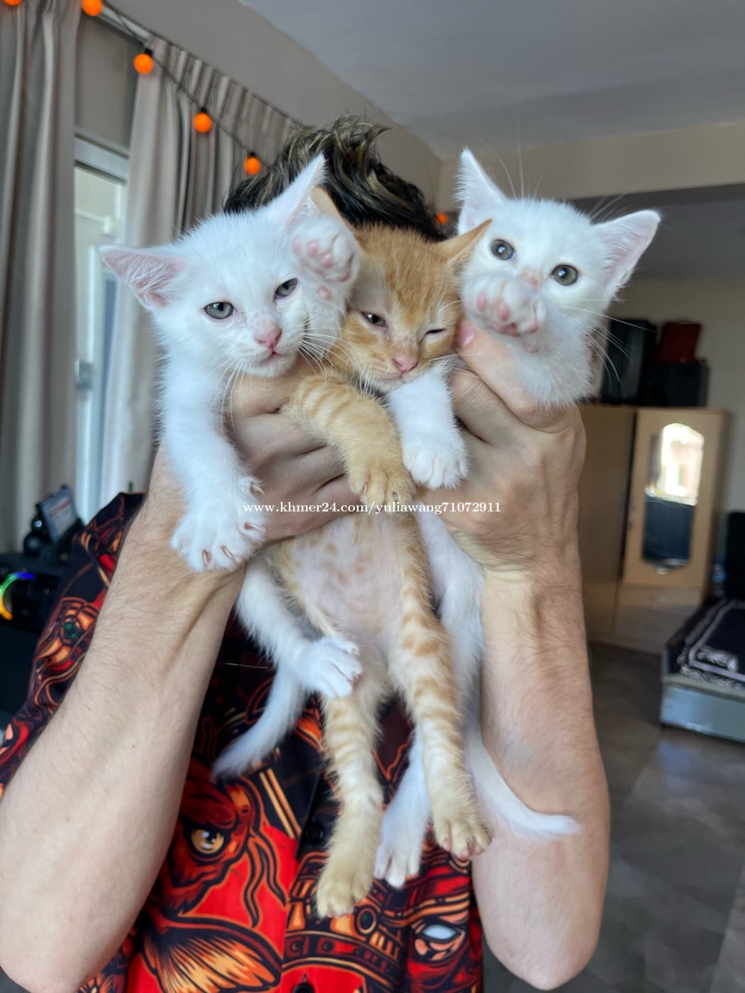 2 White kitties Khao Manee (one boy and one girls) Orange kitty - Arabian MAU From same white mother. Can eat food and can drink water and milk. Age 45 days.