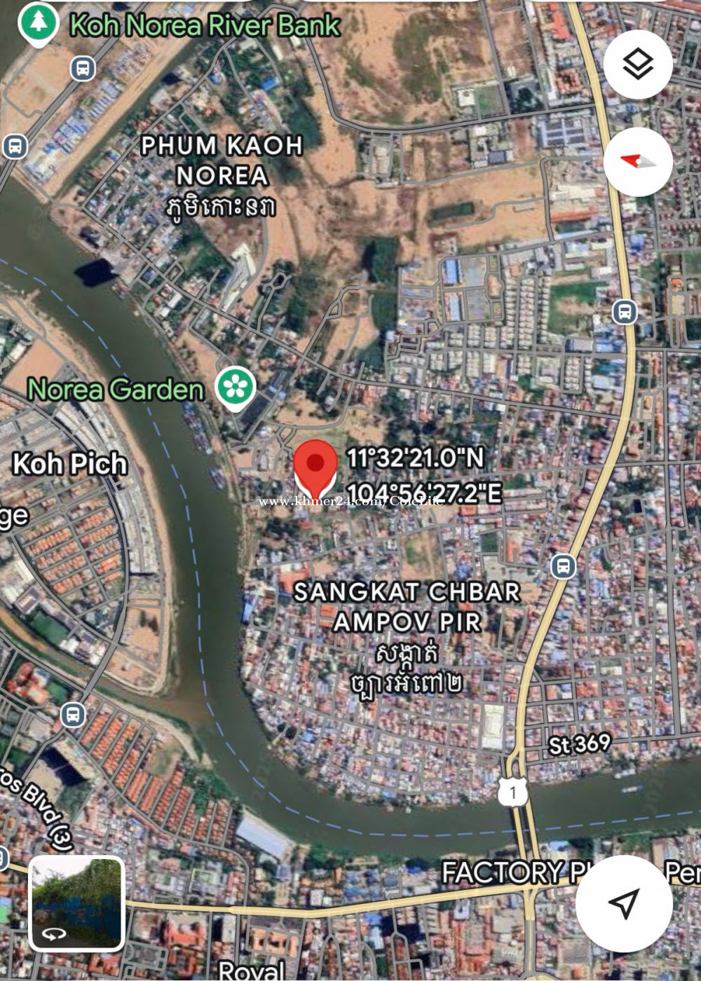 Phnom Penh , ឆ្លងស្ពានច្បារអំពៅ លើផ្លូវជាតិលេខ១ ដល់ស្តុបវត្តនិរោធ បត់ឆ្វេង លើផ្លូវ ៣៥១ ត្រង់រហូត ដីជួលនៅខាងឆ្វេងដៃ ជិតដល់មាត់ទន្លេទល់មុខកោះពេជ្រ https://maps.app.goo.gl/5zSg5JFMhKXA4AaP7?g_st=ipc