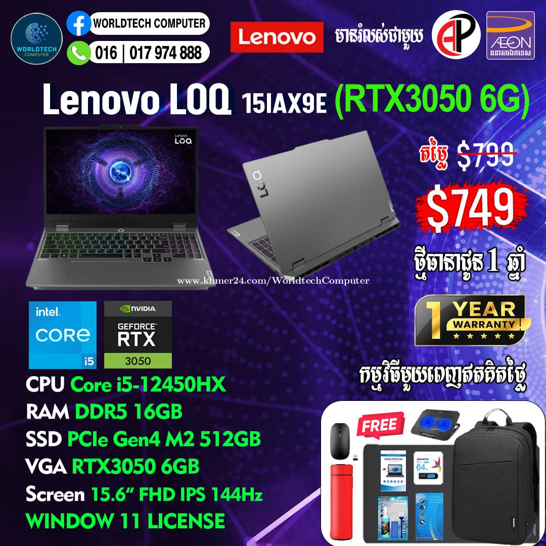 LOQ 15IAX9E i5-12450HX RAM DDR5 16G M2 512G RTX3050 6G 15.6" 144Hz New=749$ ថែមជូន ការដូរ8មុខ និងបិតអេក្រង់ជូន ថ្មីកេស ធានាមួយឆ្នាំ Telegram: 017974xxxClick To Call , 011777xxxClick To Call
