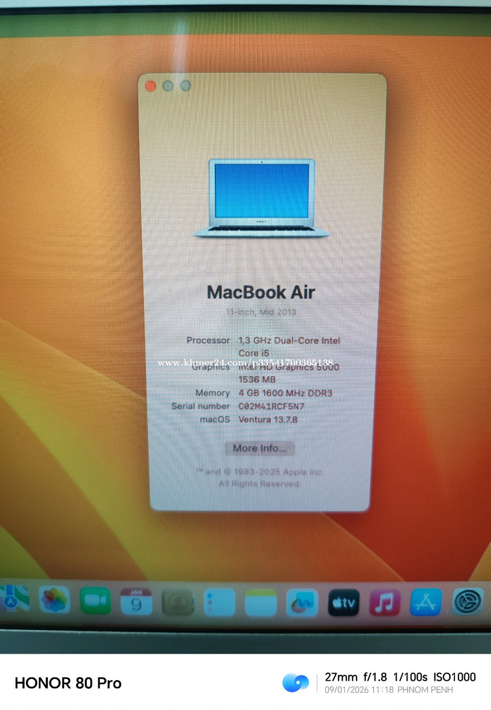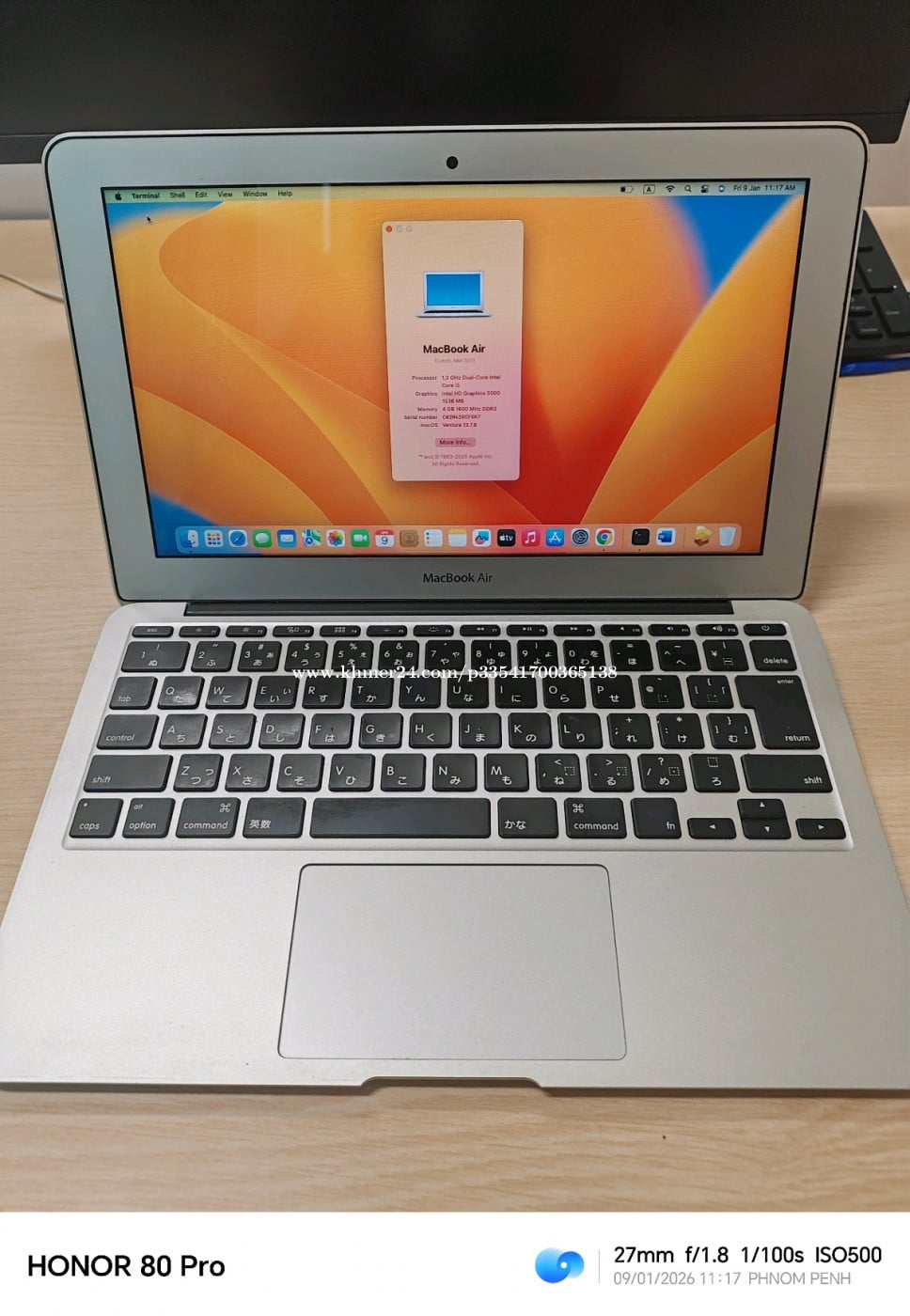 MacBook Air 11" 2013 - RAM 4GB - SSD 128 - CPU i5 - Screen 11" - Battery Good - Wifi- Bluetooth - Camera Good - Price 125$ - Call & Telegram: 081233xxxClick To Call - Location: Phnom Penh