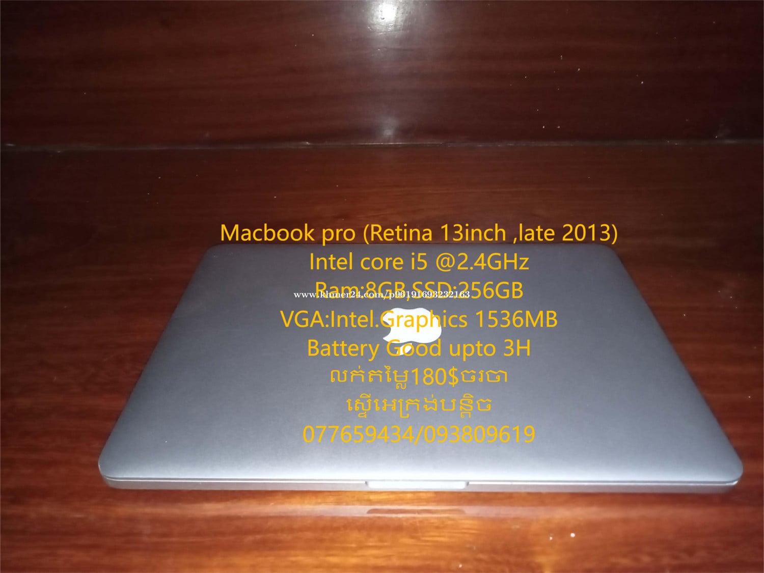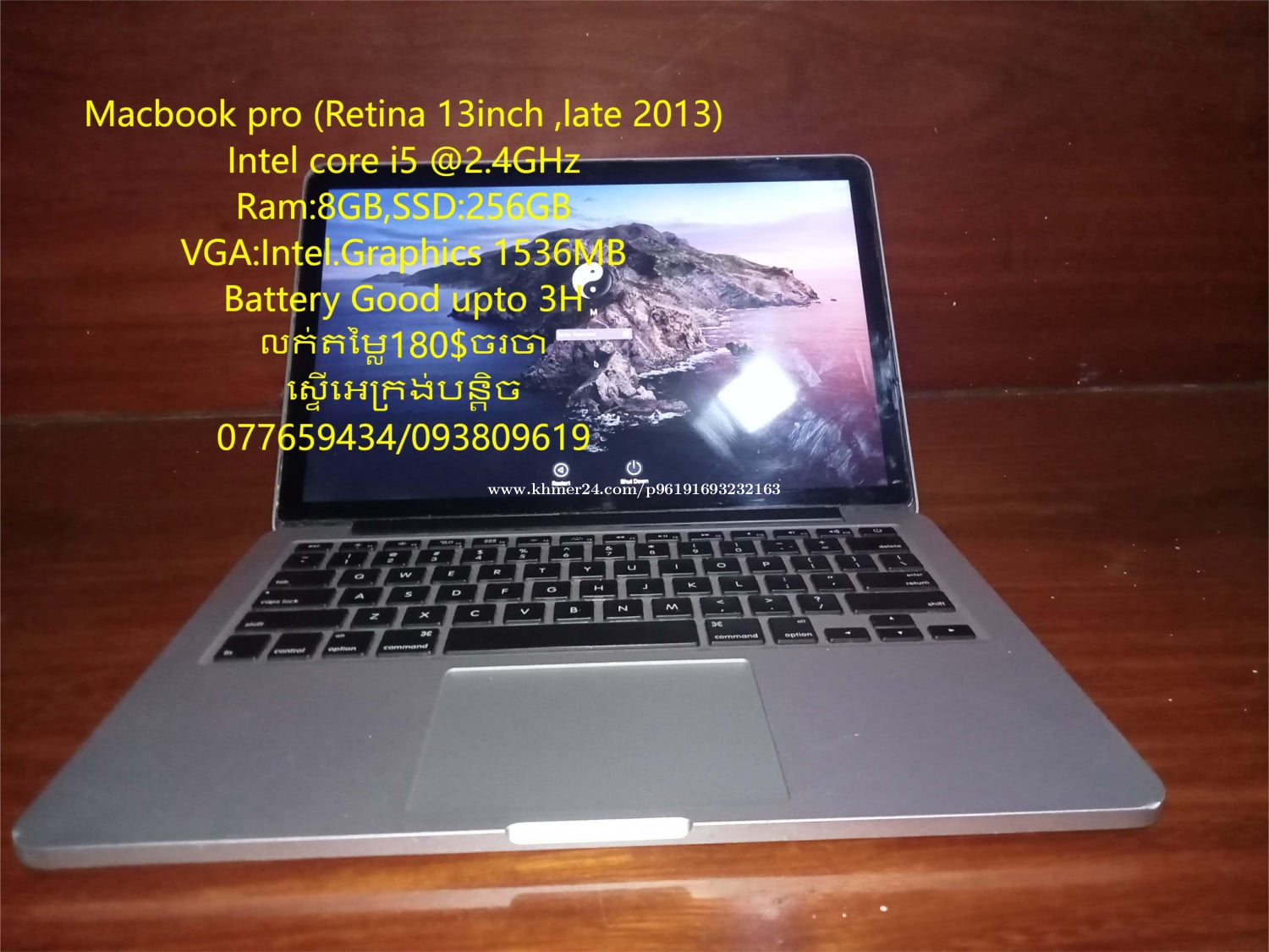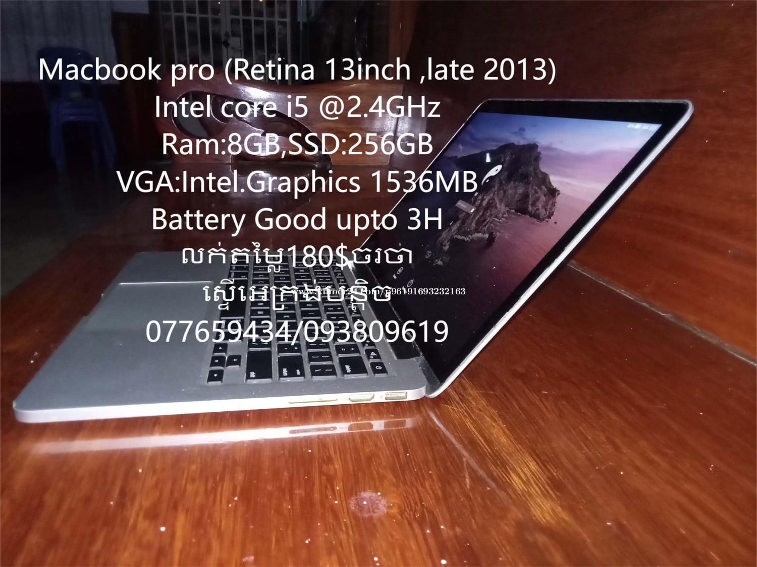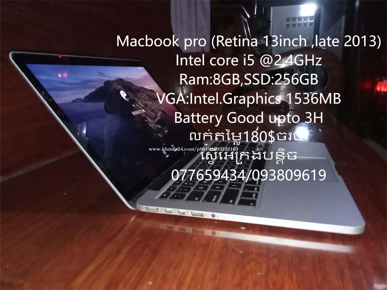 Macbook pro (Retina 13inch ,late 2013) Intel core i5 @2.4GHz Ram:8GB,SSD:256GB VGA:Intel.Graphics 1536MB Battery Good upto 3H លក់តម្លៃ160$ចរចា ស្ទើអេក្រង់បន្តិច 077659xxxClick To Call/093809xxxClick To Call