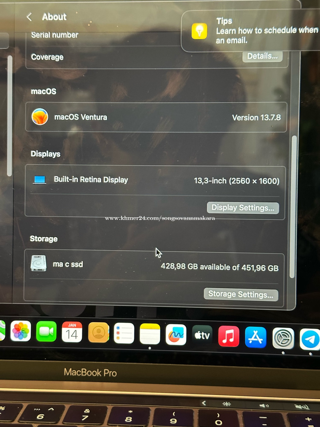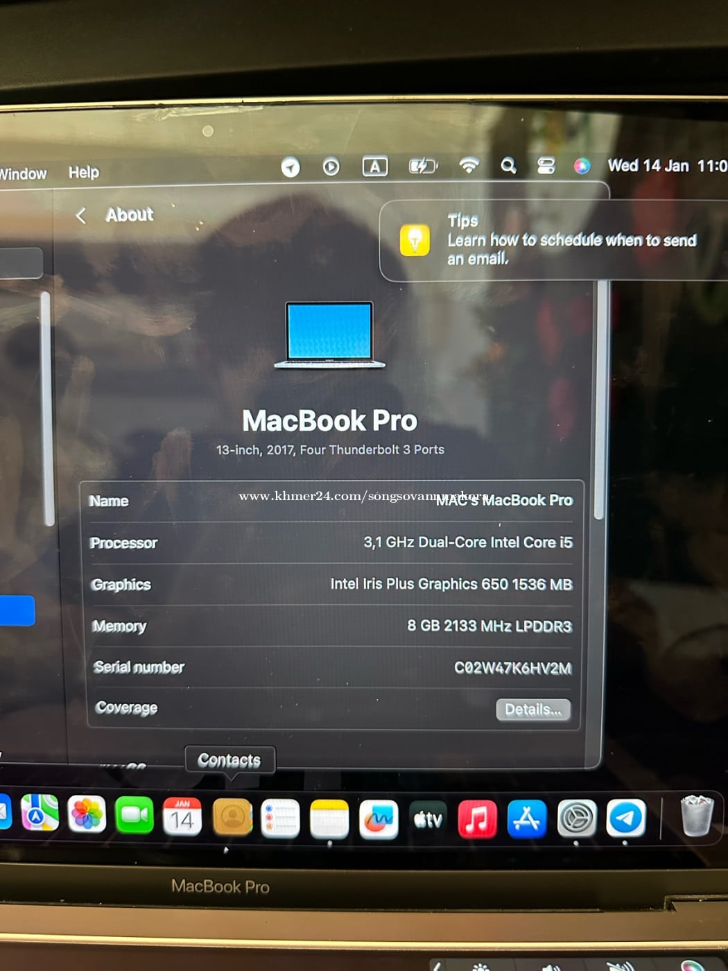 #macbookpro2017 13Inch 97% 330$ -Ram : 8G -Rom : 512G -Chip : Core I5 -battery : Low battery -Warranty : One Week Inbox : Song Sovanmakara Tell : 015777xxxClick To Call/012422xxxClick To Call ទីតាំង : នៅជិតវិទ្យាល័យជាស៊ីមសន្ធរម៉ុក (ផ្លូវ150z) https://maps.app.goo.gl/xqbgZViXRzYoPBdR6