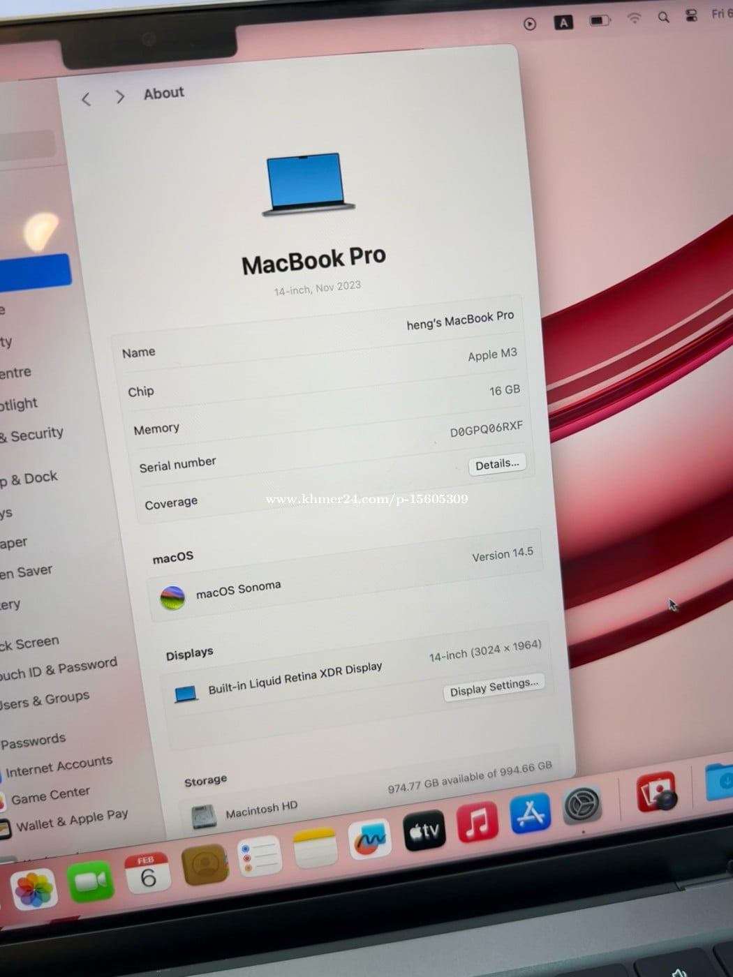 MacBook Pro m3 14inch Ram16 storage 1T ស្អាត 98% battery health 94% តម្លៃ 1098$ Call:015605xxxClick To Call☎️/:012605xxxClick To Call☎️ Telegram:https://t.me/HENG_CHENDA15 ធានាជូន: 7ថ្ងៃលើការប្រើប្រាស់😊 📍ទីតាំង : ទល់មុខម៉ុងឌីយ៉ាល់ចាស់ ផ្សារមនោរម្យអេឡិចត្រូនិចច្រកទី1 🗺️ map: https://maps.app.goo.gl/dqWtB3W7RVjLHUeN8?g_st=ic FB Page : https://www.facebook.com/share/1D4enYniS9/?mibextid=wwXIfr «ទិញដាច់ វៃដូរ សេរី បានបងបង»